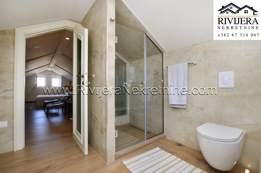 Povrsina dvorista oko objekta 150m2. Atraktivna lokacija na samoj obali mora, mogucnost veza barke/glisera ispred objekta. Udaljenost od Herceg Novog 15km, aerodroma Tivat 20km.