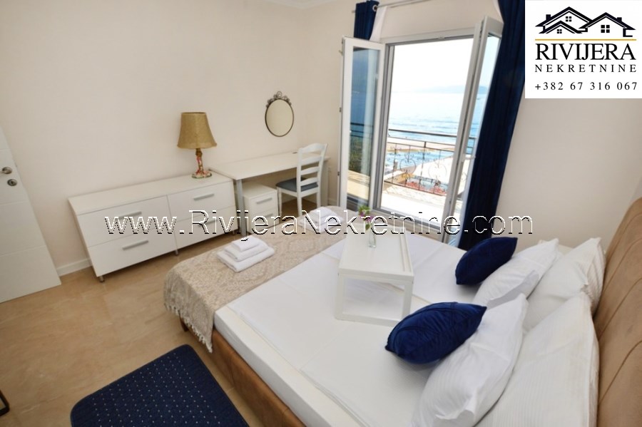 Opis: Luksuzna kuca prvi red do mora Bijela. Povrsina kuce 400m2. Prizemlje: garaza 35m2 za dva automobila,jednosoban stan 41m2 + dvorisna terasa + ostava 10m2. Prizemlje: Ljetnja kuhinja sa kupatilom 24 m2 i malo sobom, terasa ka moru 70 m2 + bazen 7 m2. Prvi sprat: trosoban stan, juznoorijentisan,opremljen 98m2. Drugi sprat: dupleks stan od 130m2 sa tri spavace sobe i dva kupatila. Kuca je u odlicnom stanju, kompletno opremljena.