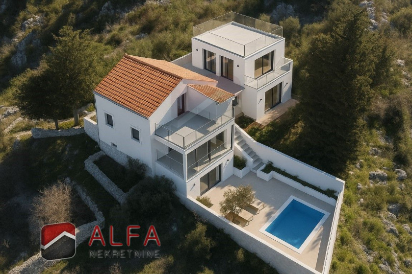 • Prvi kat: stan s jednom spavaćom sobom, kupaonicom i kuhinjom s izlazom na veliku terasu s panoramskim pogledom.