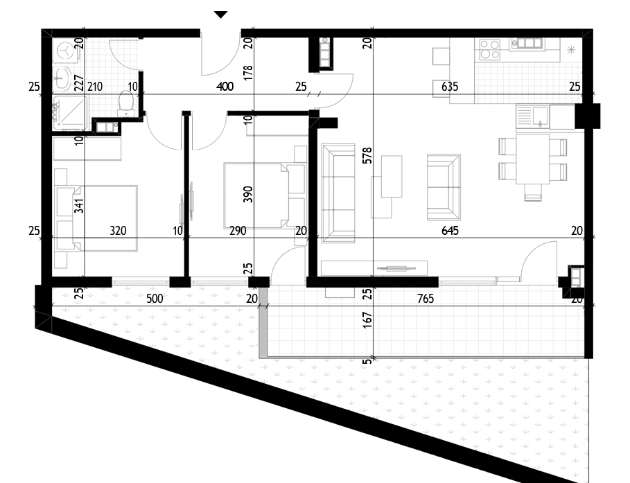 Struktura stana: ulazni hodnik, veliki dnevni boravak, kuhinja, dvije spavaće sobe, kupatilo i dvije terase.
