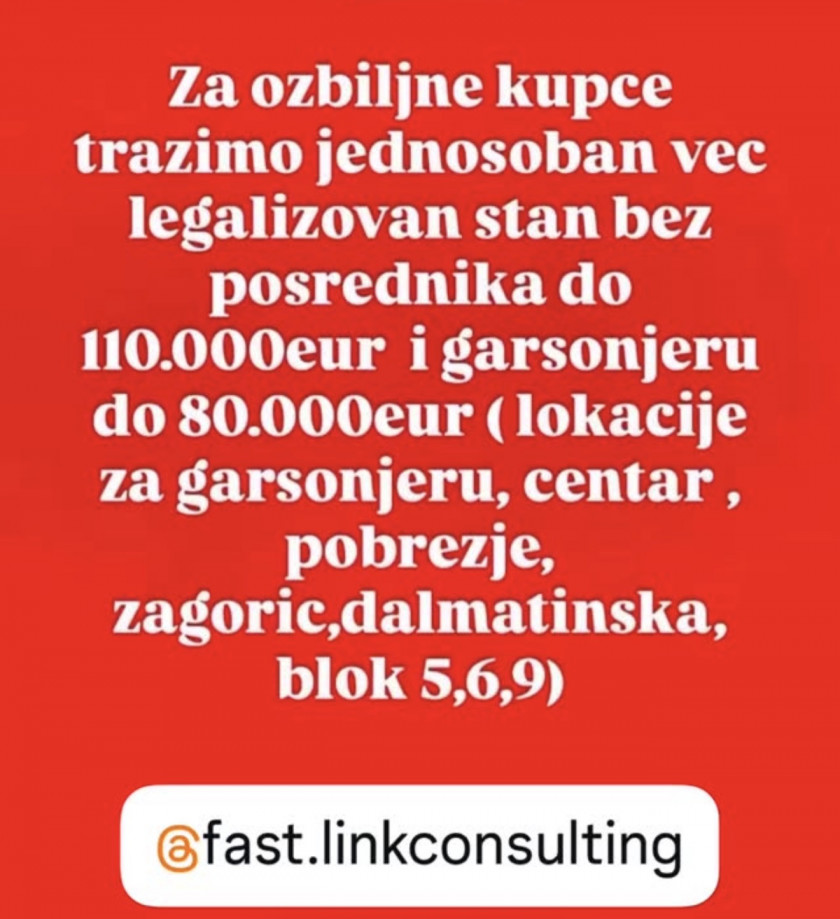 Opis: Za ozbiljne kupce trazimo jednosoban stan do 110000 i garsonjeru do 80000 (lokacija garsonjere centar, preko Morace, blokovi 5,6,9 , dalmatinska, Vezirov most) . Stanovi moraju biti legalizovani. Bez agencija i posrednika