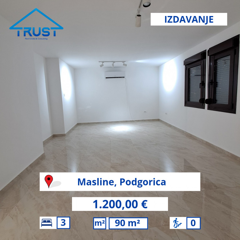 Vrsta: Poslovni Prostor za Duži Najam Područje: Podgorica Lokacija: Masline Cijena: €1.200 Spavaćih Soba: 3 Kupatila: 1 Stambena Površina: 90 m2 Parking Mjesta: 3 Klima Uređaj Čuvajte se prevara: NE vršite IBAN uplate