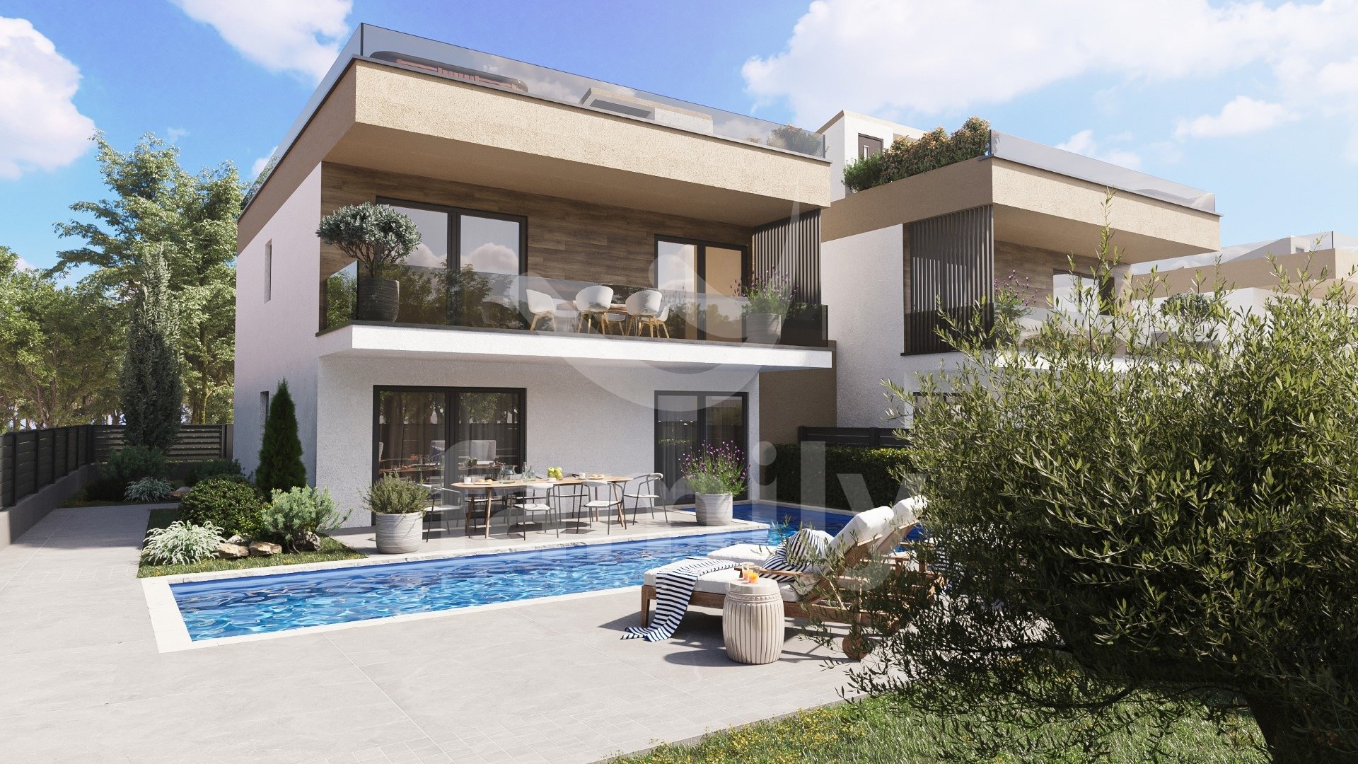 Upravo u Brtonigli se nalazi navedena dvojna kuća u izgradnji sa stambenom površinom od 149 m2. Kuća se proteže na dvije etaže te će se prizemlje iste sastojati od veoma prostranog dnevnog boravka open space koncepta spojenog sa kuhinjom i blagavaonicom sa izlazom na natkrivenu terasu kao i gostinjskim wc-om i spremištem. Na drugoj etaži kojoj će se prilaziti unutarnjim stepeništem predviđene su tri komforne spavaće sobe, svaka sa svojim kupatilom. Kući će također pripadati bazen površine 24 m2. Na cijelom objektu je planirana ugradnja PVC i ALU stolarije....