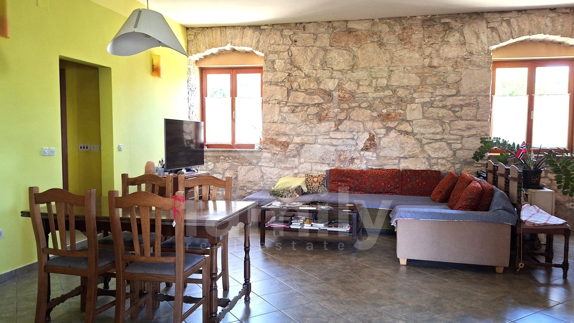Na mirnoj lokaciji samo 4 km od mora prodaje se ova šarmantna kamena kuća, sveukupne površine od 136 m2 okružena zelenilom. Navedena nekretnina se sastoji od komotne, ugodne natkrivene terase, prostranog predprostora, komfornog dnevnog boravka sa otvorenim kuhinjskim dijelom i blagovaonom kao i dvije spavaće sobe te kupatilom. Kuća je lijepo osvijetljena dnevnim svjetlom. Grijanje je regulirano putem peći na drva i klima jedinicom. Podovi kuće su obloženi laminatom u sobama, pločicama u dnevnom prostoru kao i kupatilu. Stolarija je drvena kao i drvene škure na prozorima. Potpuni sklad ovoj nekretnini pruža kvalitetno, prostrano dvorište velićine 618 m2 koje posjeduje najmanje četiri parkirna mjesta....