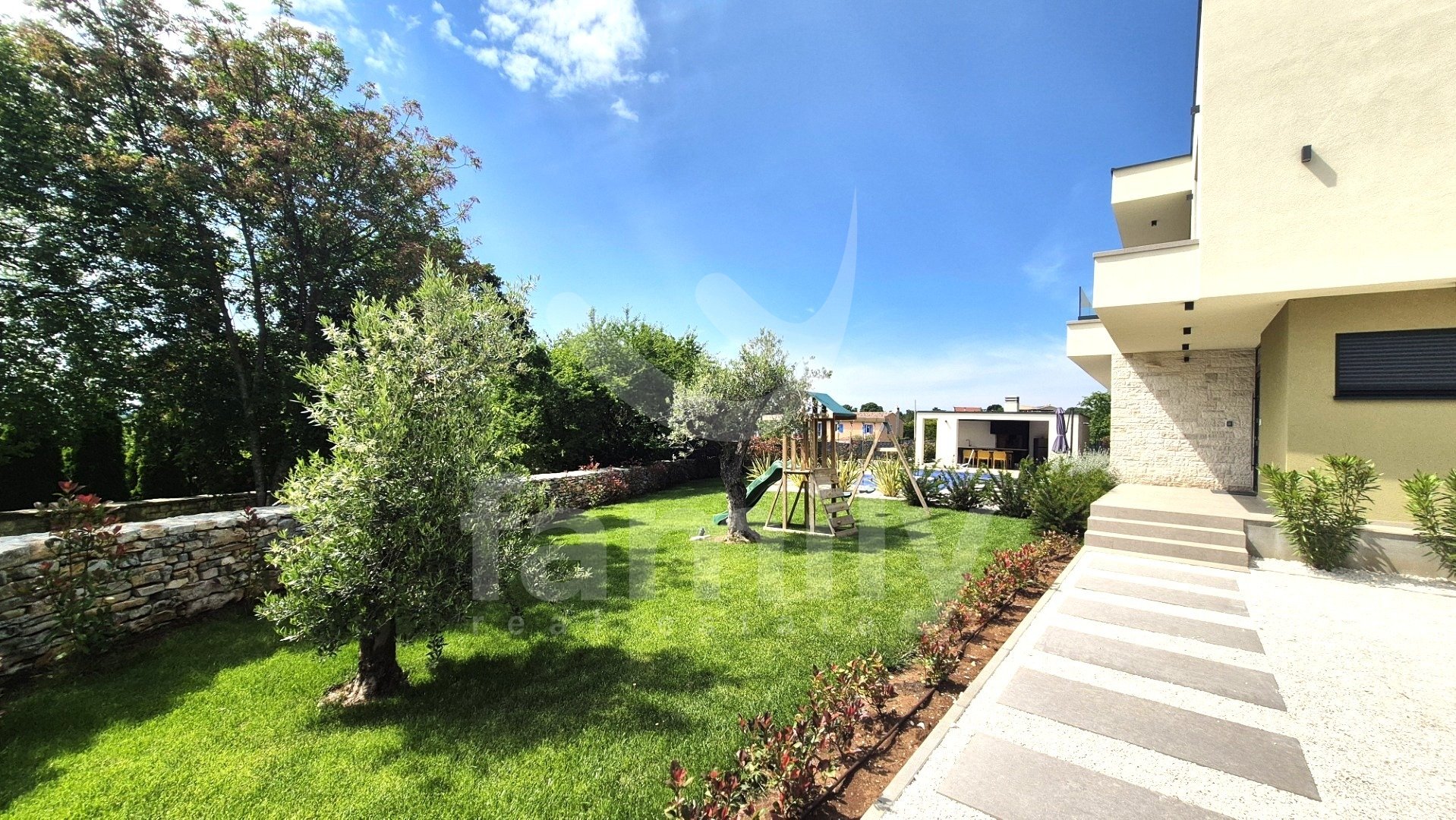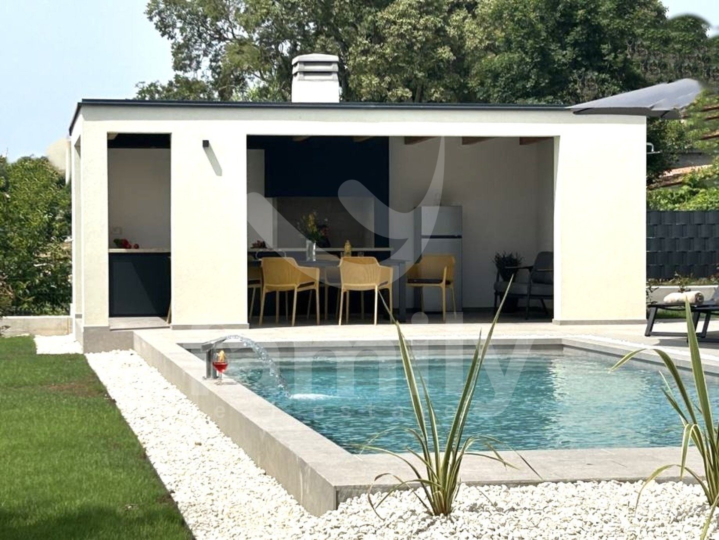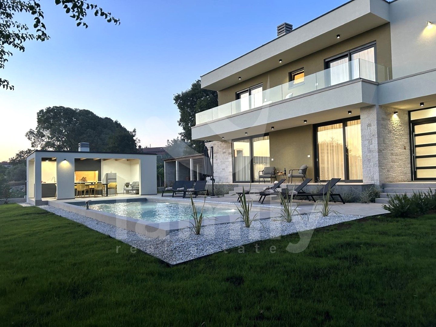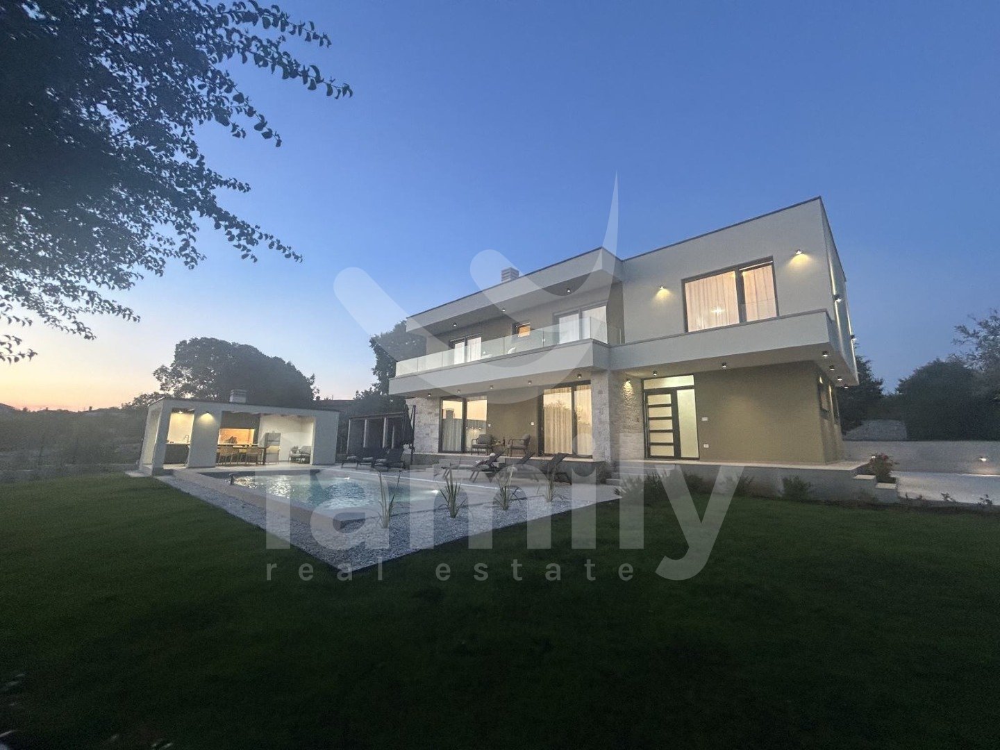 Vila sveukupne površine 208 m2 pozicijonirana je na jugozapanoj strani na kraju urbaniziranog dijela. Cijela čestica je ograđena zidom, ulazna vrata su električna s tri parkirna mjesta u dvorištu. Okućnica je uređena i održavana s ljubavlju a travnjak posjeduje automatsko navodnjavanje. U vanjskom dijelu posjedujemo natkriveni pomoćni objekt s kaminom za druženje i boravak kao i grijani bazen sveukupne površine 40 m2. Garažni dio je također odvojen. Kuća je opremljena izuzetno lijepo i moderno i takva se i prodaje. Prvi ulazni dio posjeduje dnevni dio s blagavaonicom, kuhinjom i wc-om za goste....
