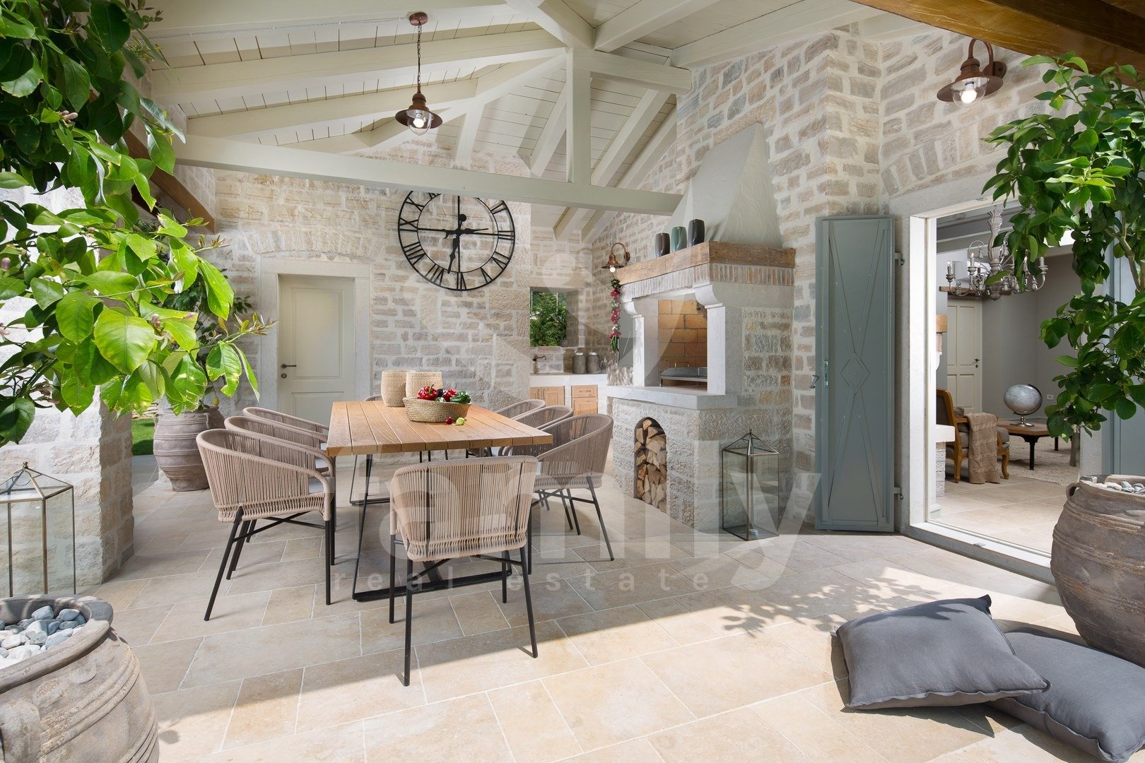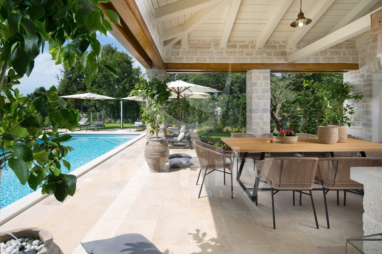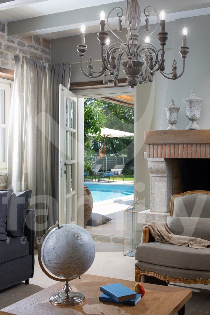 Nedaleko od Kanfanara, u manjem naselju smještena je ova predivna i raskošna vila površine 359 m2 sa okućnicom površine 880m2. Vila se prostire na dvije etaže, prizemlje i prvi kat. U prizemlju se nalazi izuzetno prostrani i osvijetljeni dnevni boravak sa otvorenim kaminom iz kojeg se izlazi na prostranu natkrivenu terasu, moderno rustikalna, kvalitetna kuhinja sa blagovaonicom, spavaća soba sa svojom kupaonicom i još jedan toalet za goste te je cijelo prizemlje obloženo kvalitetnim talijanskim dizajnerskim pločicama....