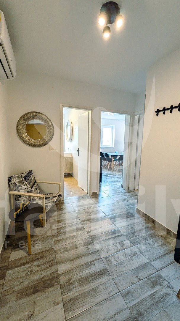 Stan od 46 m2 kompletno je renoviran i opremljen modernim uređajima, čineći ga ugodnim za život ili atraktivnom investicijom za turistički najam. Nalazi se na samo 800 metara od mora i sastoji se od kuhinje s blagovaonicom, dnevnog boravka, te jedne spavaće sobe i kupaonice. Dvoslojna stakla i alu grilje pridonose toplinskoj i zvučnoj izolaciji, dok balkon pruža savršeno mjesto za opuštanje na svježem zraku. U sklopu stana dolazi i drvarnica u podrumu....