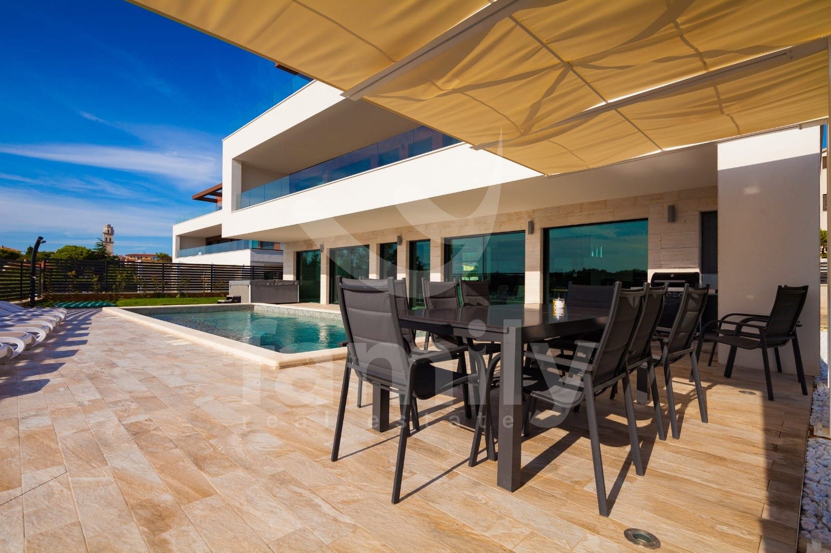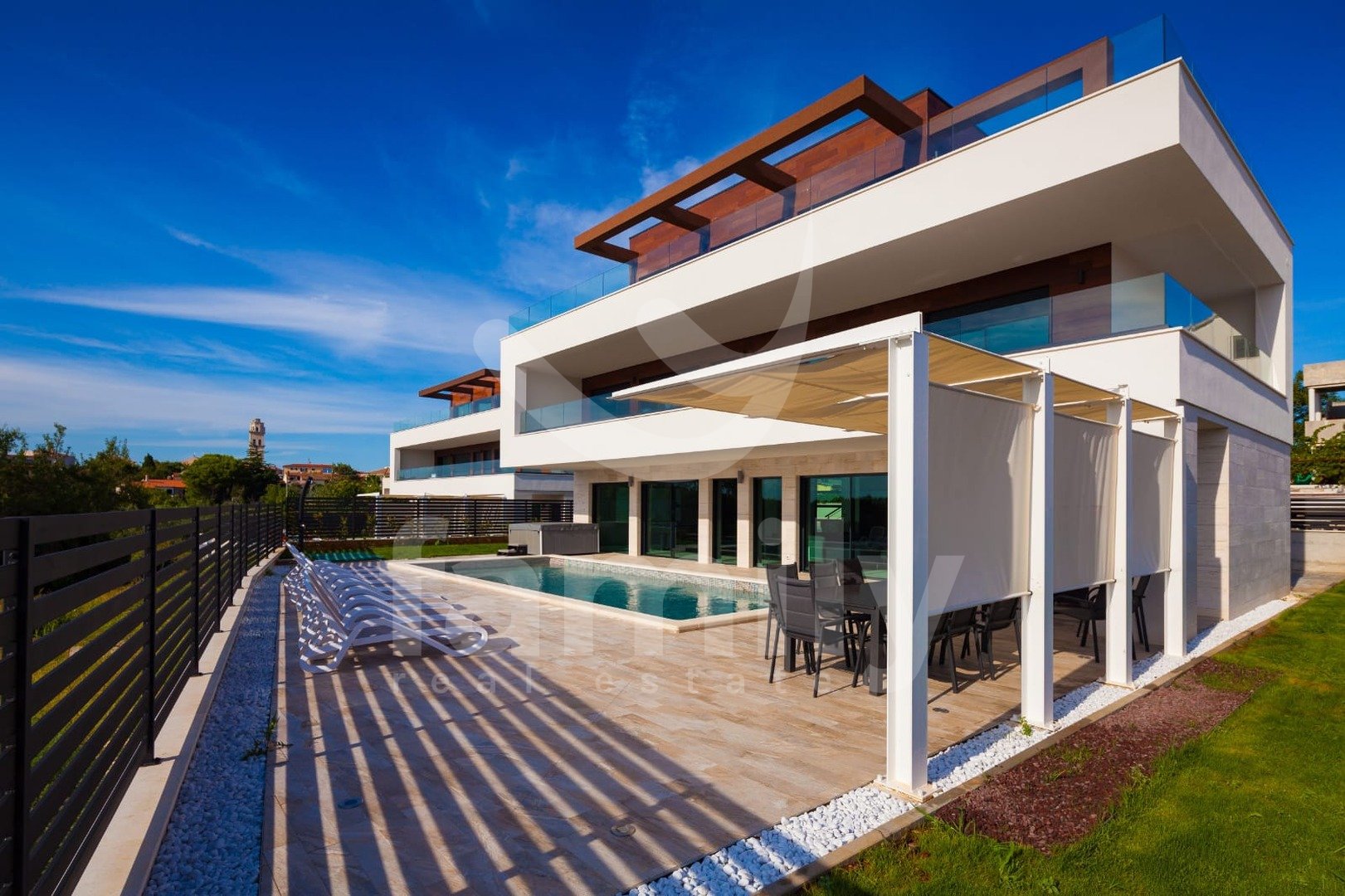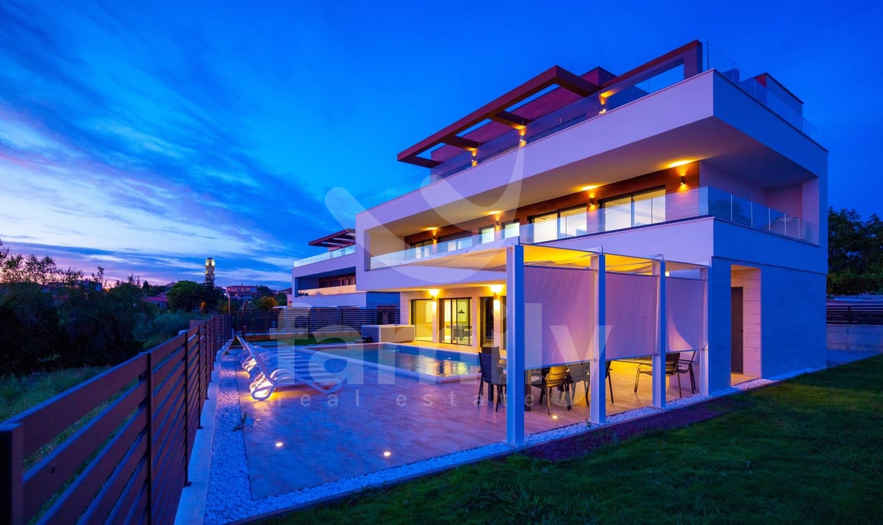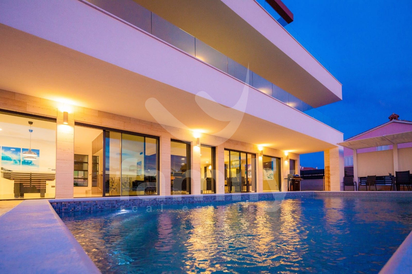 Upravo u naselju Premantura smještena je ova luksuzna vila sa bazenom na svega 400 m od mora s predivnim panoramskim pogledom na more. Vila je smještena na zemljištu površine 633 m2, a proteže se na tri etaže sa ukupno 480 m2 bruto stambene površine.