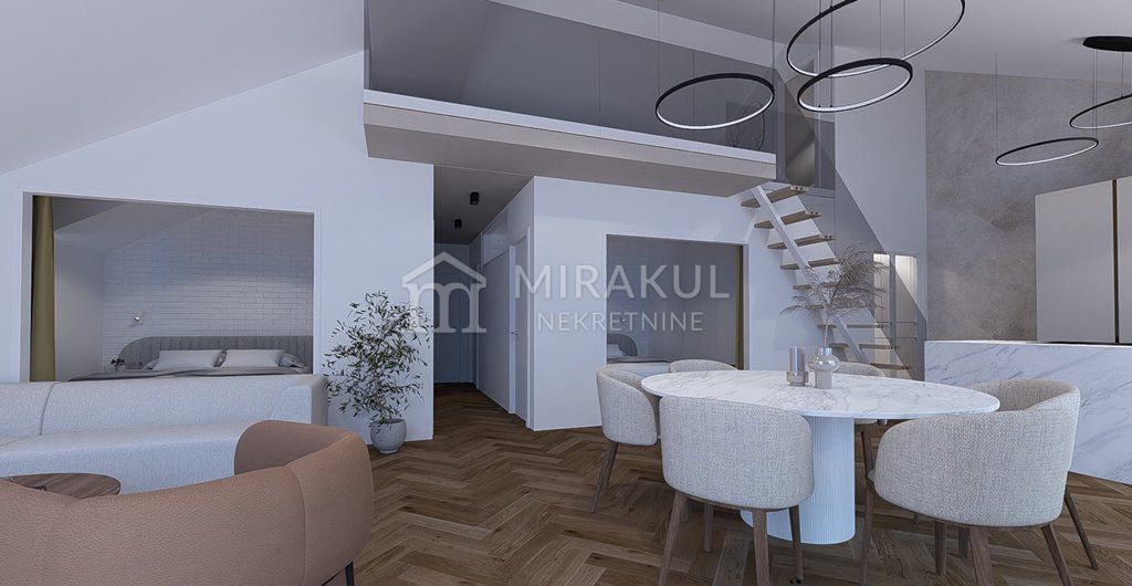 STAN S9 se nalazi u potkrovlju, a sastoji od: predprostora, tri spavaće sobe, 2 kupaonice, hodnika, kuhinje / blagovaonice / dnevnog boravka, galerije te otvorenim dijelom: natkrivene terase i nenatkrivene terase. Stan S9 ima sveukupnu korisnu vrijednost površine: 138,82 m2