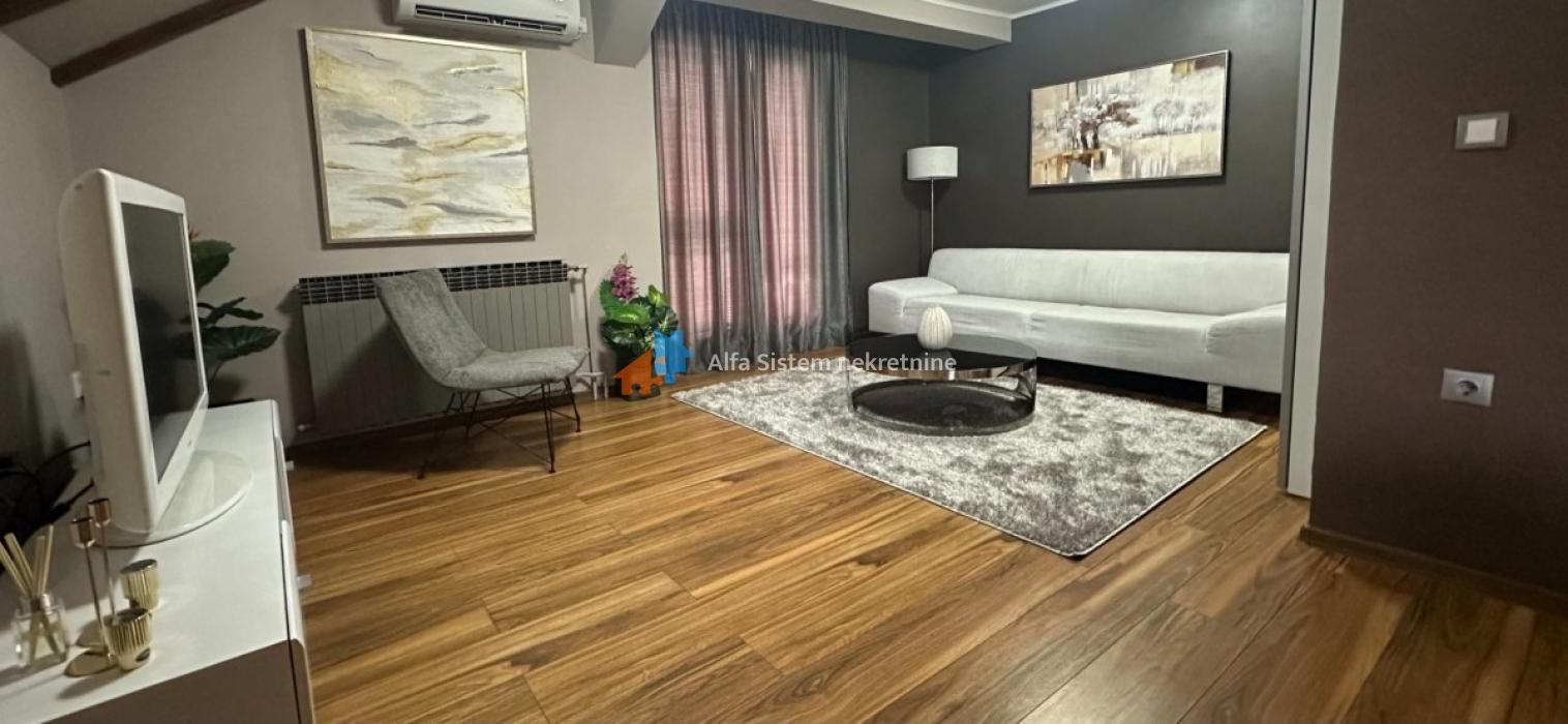 penthouse u butik zgradi, 80m2(ukljucujuci dve terase), u mirnom delu grada. Potpuno renoviran, namesten i opremljen, odmah useljiv.