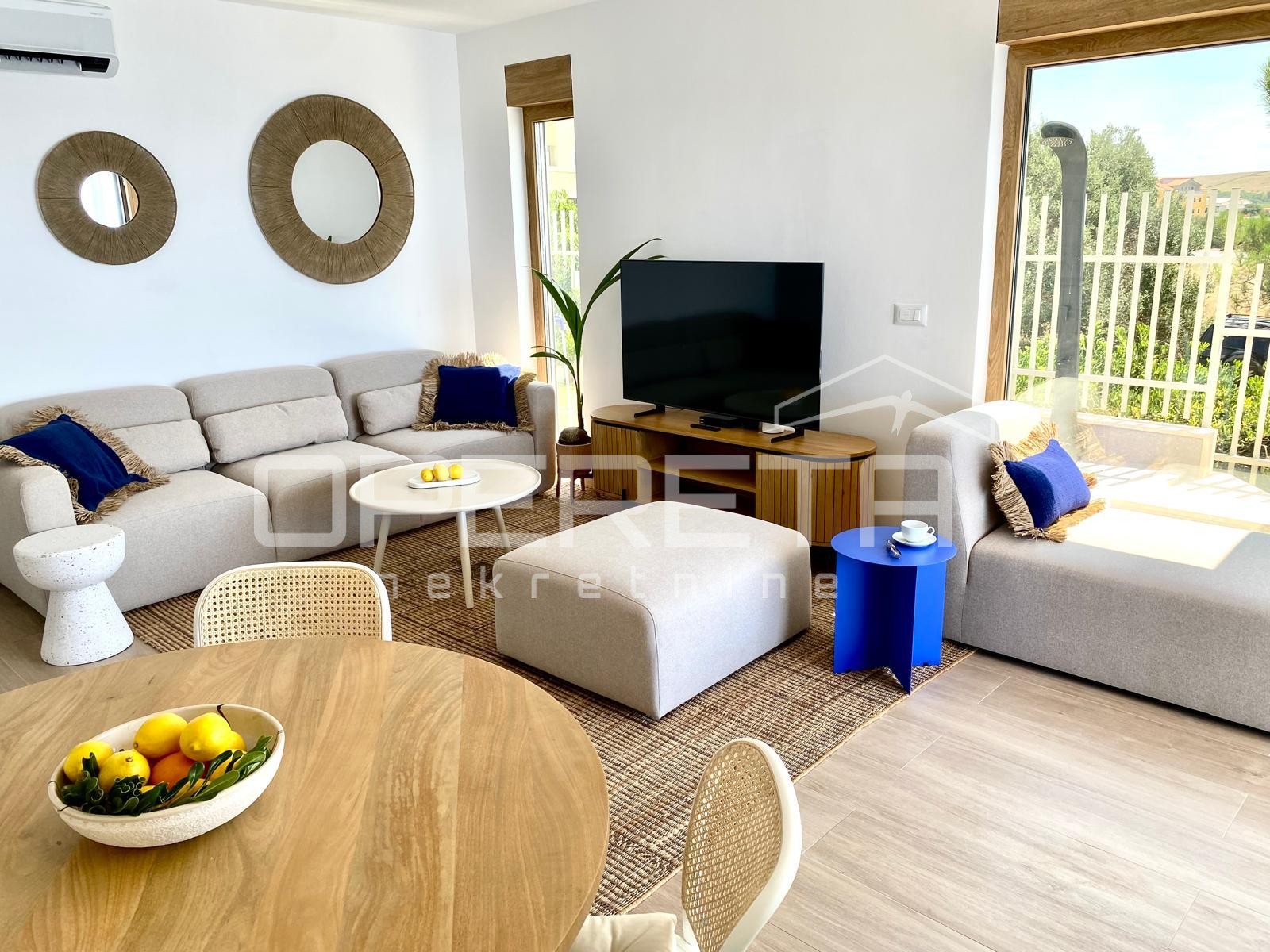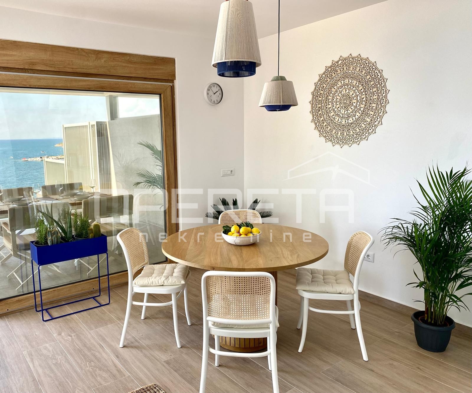 Opis: Luksuzan dvoetažan stan, 1. red do mora, Povljana, PagIz Operetine ponude luksuznih nekretnina izdvajamo dvoetažan stan smješten u prizemlju nove stambene zgrade, na ekskluzivnoj lokaciji u prvom redu do mora, u mirnom dijelu Povljane na otoku Pagu.Stan se prodaje potpuno namješten, spreman za useljenje ili turistički najam. Jugozapadna orijentacija osigurava obilje prirodnog svjetla tijekom cijelog dana.Ukupna površina stana sa svim pripadcima je 185 m², dok ukupna neto stambena površina iznosi 85 m². Raspored uključuje hodnik, dvije spavaće sobe, kupaonicu, dodatni WC te prostrani open-space dnevni boravak s kuhinjom i blagovaonicom. Iz dnevnog prostora izlazi se na veliku terasu s grijanim infinity bazenom i spektakularnim, otvorenim pogledom na more.Dodatnu vrijednost daje donja etaža površine 45 m², opremljena wellness prostorom sa saunom, mini teretanom i spremištem.Stanu pripada i uređeni vrt površine 69 m², grijani infinity bazen od 19 m² te natkriveno parkirno mjesto s mogućnošću postavljanja punjača za električna vozila....