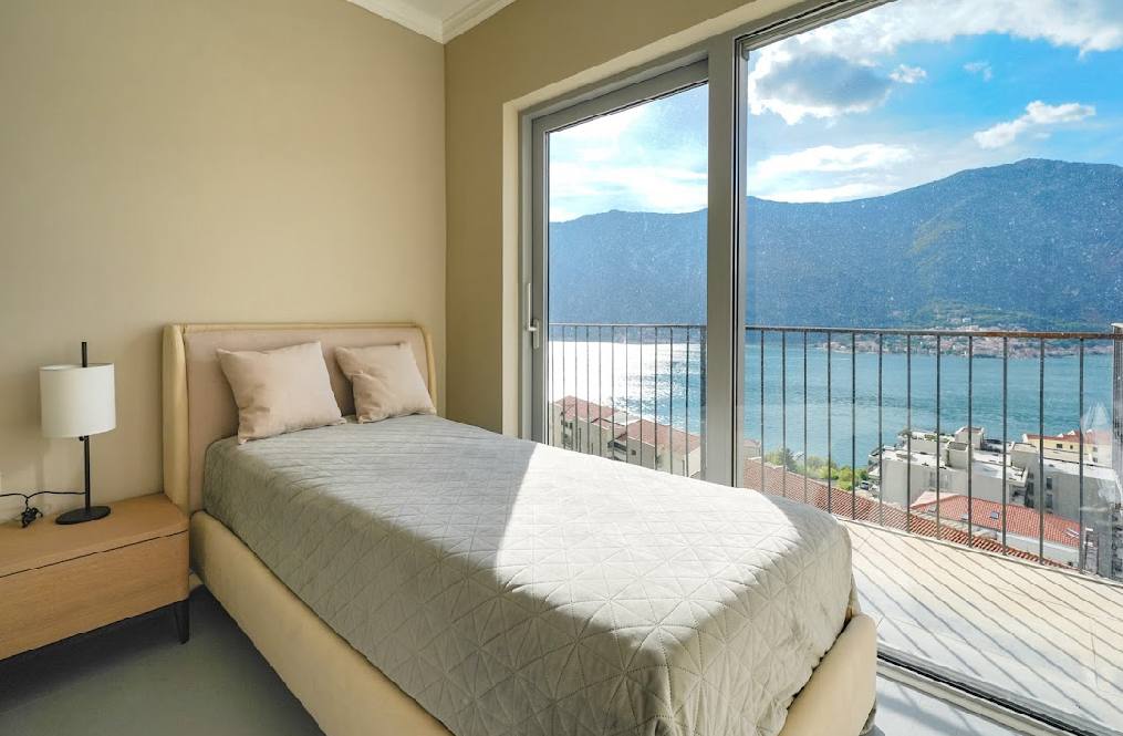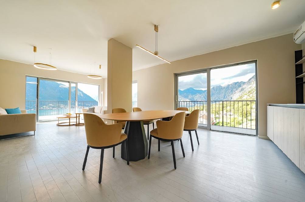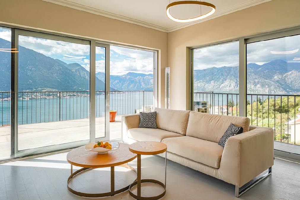 Na prodaju se nudi elegantan stan s prelijepim panoramskim pogledom na Bokokotorski zaliv iz svake prostorije — idealna prilika za udoban život ili investiciju u jednom od najprestižnijih dijelova Crne Gore.