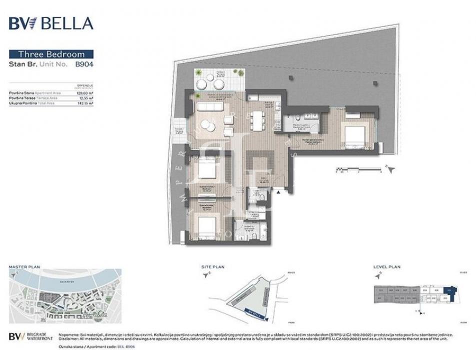 Opis: Prodaje se prostran trosoban stan u izgradnji površine 142,15 m2 u ekskluzivnom kompleksu BW Bella, u okviru najprestižnijeg beogradskog naselja Beograd na vodi. Stan se nalazi na 9. spratu od ukupno 20, sa prelepim pogledom na Savu i panoramu grada.