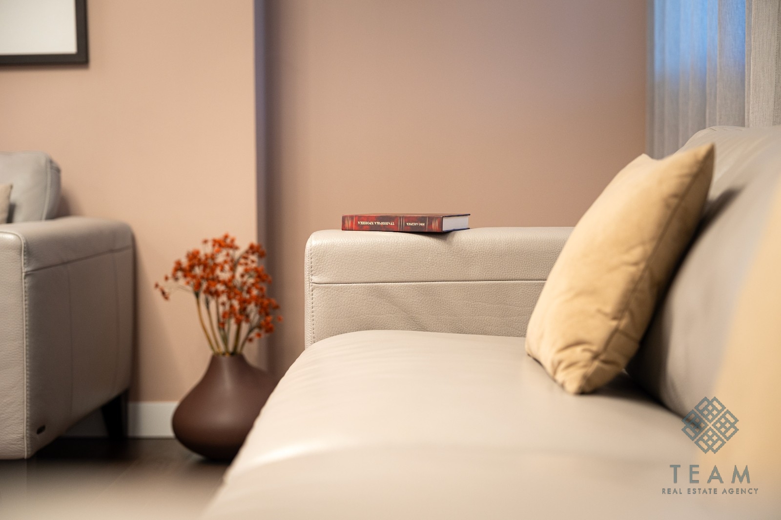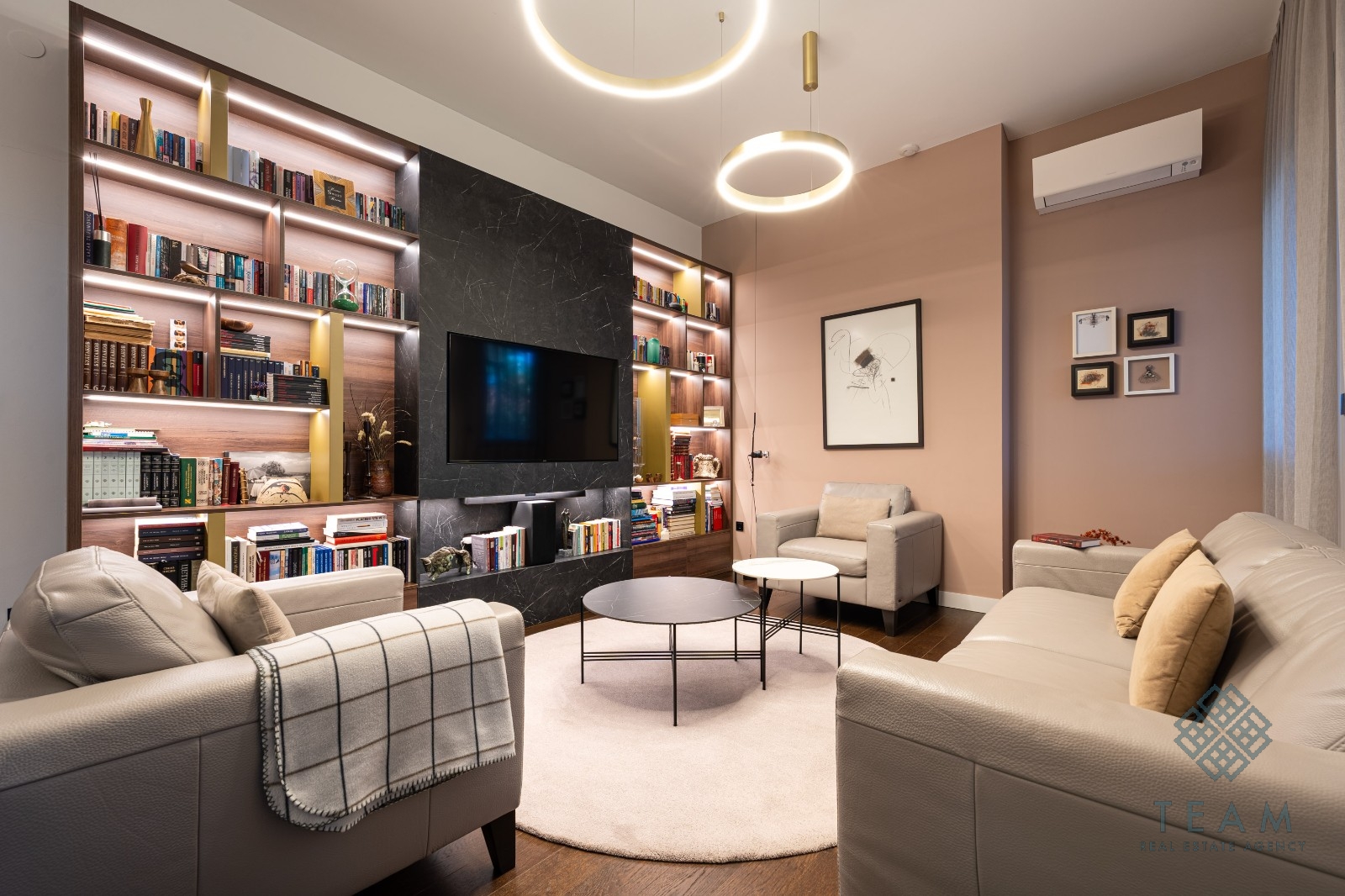 Stan se odlikuje vrhunskim enterijerom sa pažljivo odabranim dizajnerskim namještajem i funkcionalnim rasporedom prostorija. Sastoji se od prostranog dnevnog boravka sa trpezarijom i moderno opremljenom kuhinjom, dvije spavaće sobe, kupatila i dodatnog toaleta.
