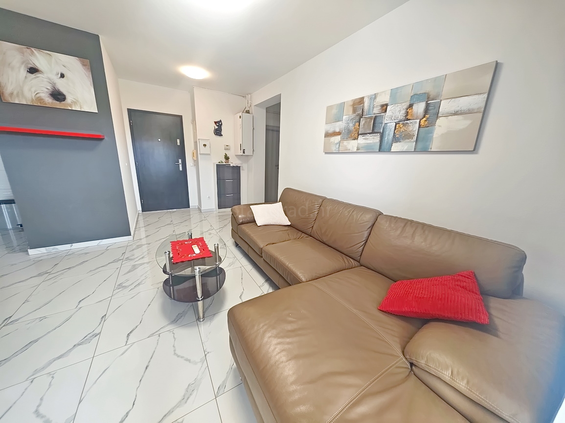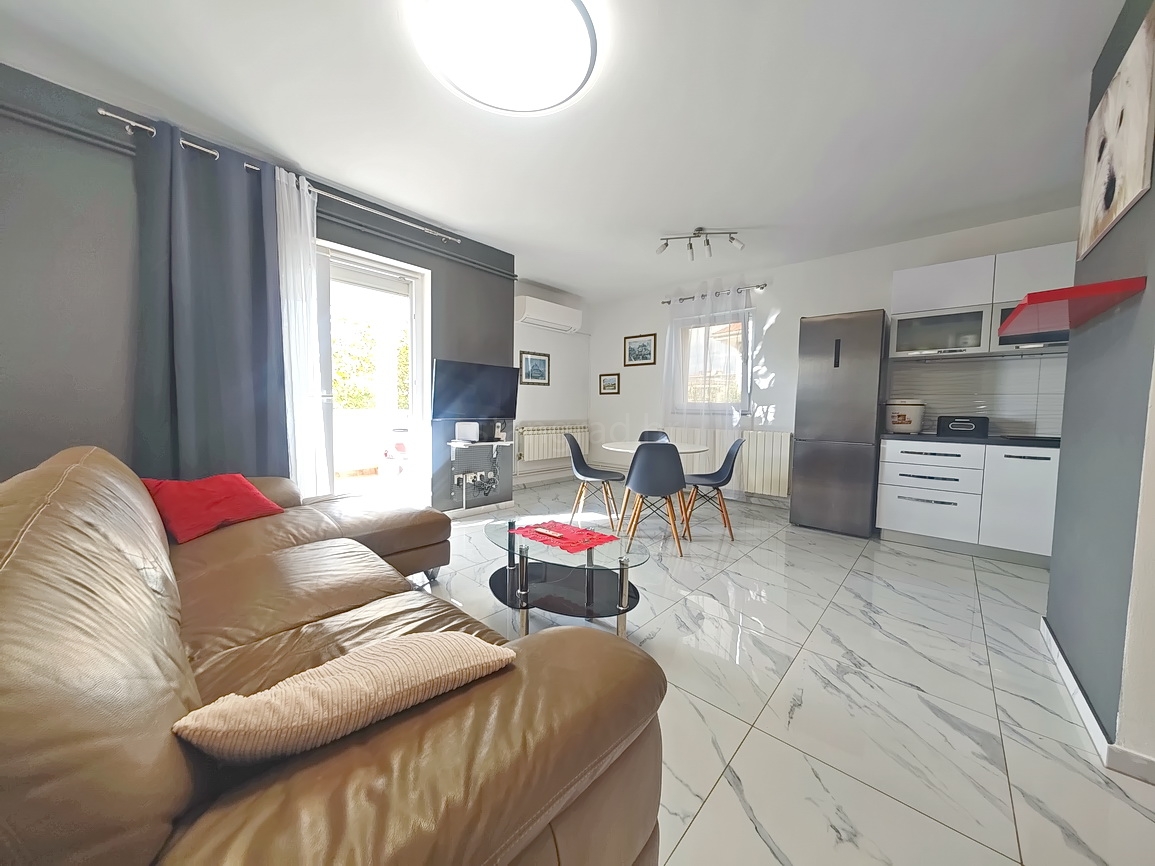 Smješten na prvom katu kvalitetno izgrađene zgrade, apartman ukupne površine 62 m² sastoji se od ulaznog hodnika, prostranog dnevnog boravka povezanog s kuhinjom i blagovaonicom, dvije spavaće sobe, kupaonice i lođe. Nekretnina je dobro očuvana, djelomično opremljena kvalitetnim namještajem i pouzdanom tehničkom opremom.
