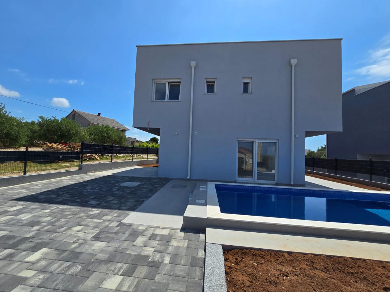 Opis (Engleski): For sale is a newly built luxury villa with a swimming pool, situated in a peaceful area just 1.5 km from the crystal-clear sea and beautiful beaches on the island of Vir, Croatia. The villa spans 142 m² of elegantly designed living space on a 335 m² plot, offering the ideal combination of modern comfort, privacy, and authentic Mediterranean charm.The ground floor features a covered entrance that opens into a bright hallway, a stylish kitchen with a dining area, and a spacious open-concept living room — perfect for family gatherings, entertaining, or relaxing after a day at the beach. This level also includes a guest toilet and a modern staircase that leads to the upper floor.The upper floor consists of three spacious bedrooms, each with a private bathroom and stunning sea views, ensuring comfort, functionality, and privacy for all residents....