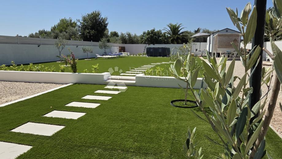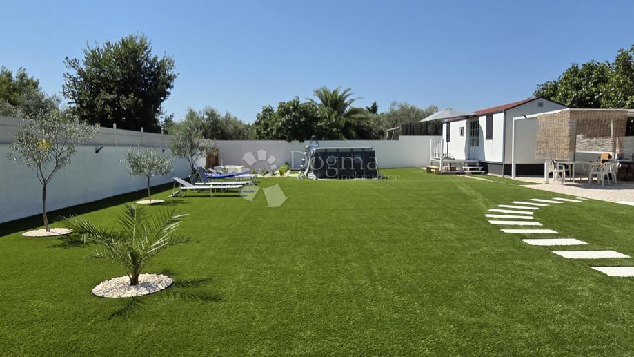 Površina zemljišta je 693m2, zemljište je kompletno ograđeno i vrlo lijepo uređeno, posađeno je 6 mladih maslina, palma, bungavilija i lovor višnja dok je na tlo postavljena umjetna trava.