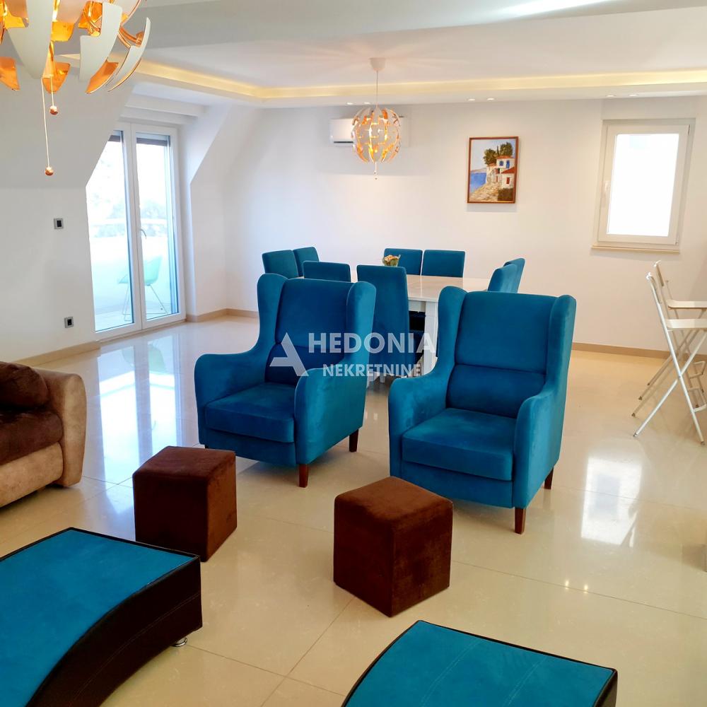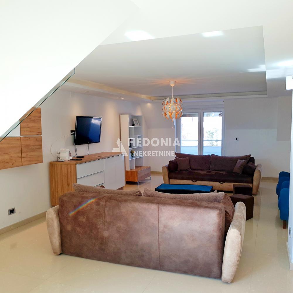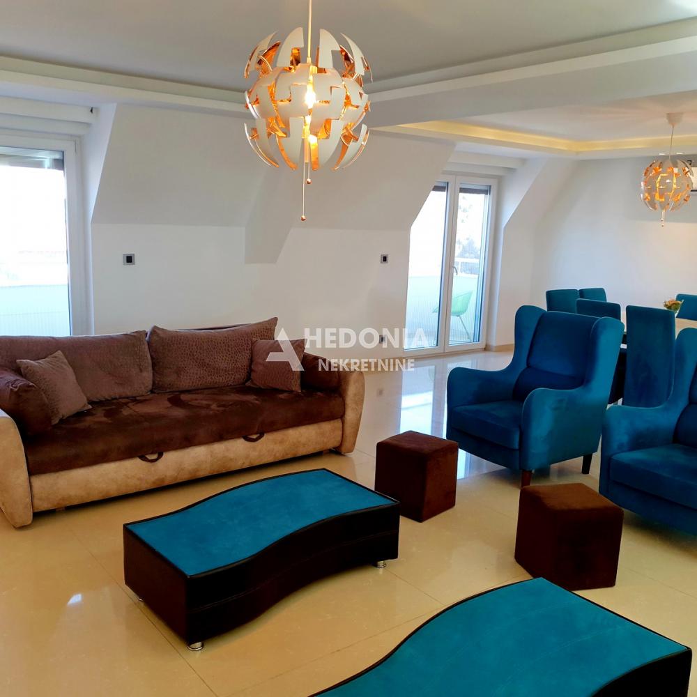 Opis: U mirnom delu naselja Lekino brdo, prodaje se ovaj nov četvorosoban stan. Smešten je na trećem spratu uredne i održavane zgrade sa liftom. U neposrednoj blizini su vrtić, škole, marketi kao i svi ostali neophodni sadržaji za udoban život. Saobraćajna povezanost sa ostalim delovima grada je odlična. Stan je penthaus, luksuzan, sa prelepim pogledom na čitav grad. Veoma je svetao i trostrano orijentisan. Poseduje mermerni pod sa podnim grejanjem na struju što pruža dodatnu udobnost za stanovanje. U stanu su i tri velike inverter klime, a kontrola grejanja, svetla i roletni je po principu pametne kuće. Sastoji se od predsoblja, dnevne sobe sa trpezarijom i kuhinjom, tri spavaće sobe, od kojih je jedna na donjem nivou, dva kupatila, na svakom nivou po jedno i tri terase. Do stana se dolazi liftom koji ide i do garaže. Stanu pripada i garažno mesto, koje je se prodaje po ceni od 30.000 EUR. Stan je uknjižen na 133m2, dok merene površine zajedno sa terasom ima 163m2.