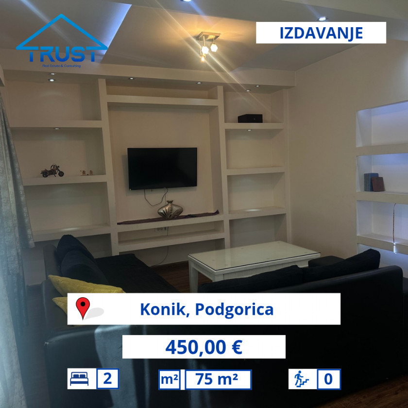 Vrsta: Stan-Apartman za Duži Najam Područje: Podgorica Lokacija: Konik Cijena: €450 Spavaćih Soba: 2 Kupatila: 1 Stambena Površina: 75 m2 Parking Mjesta: 1 Klima Uređaj Čuvajte se prevara: NE vršite IBAN uplate