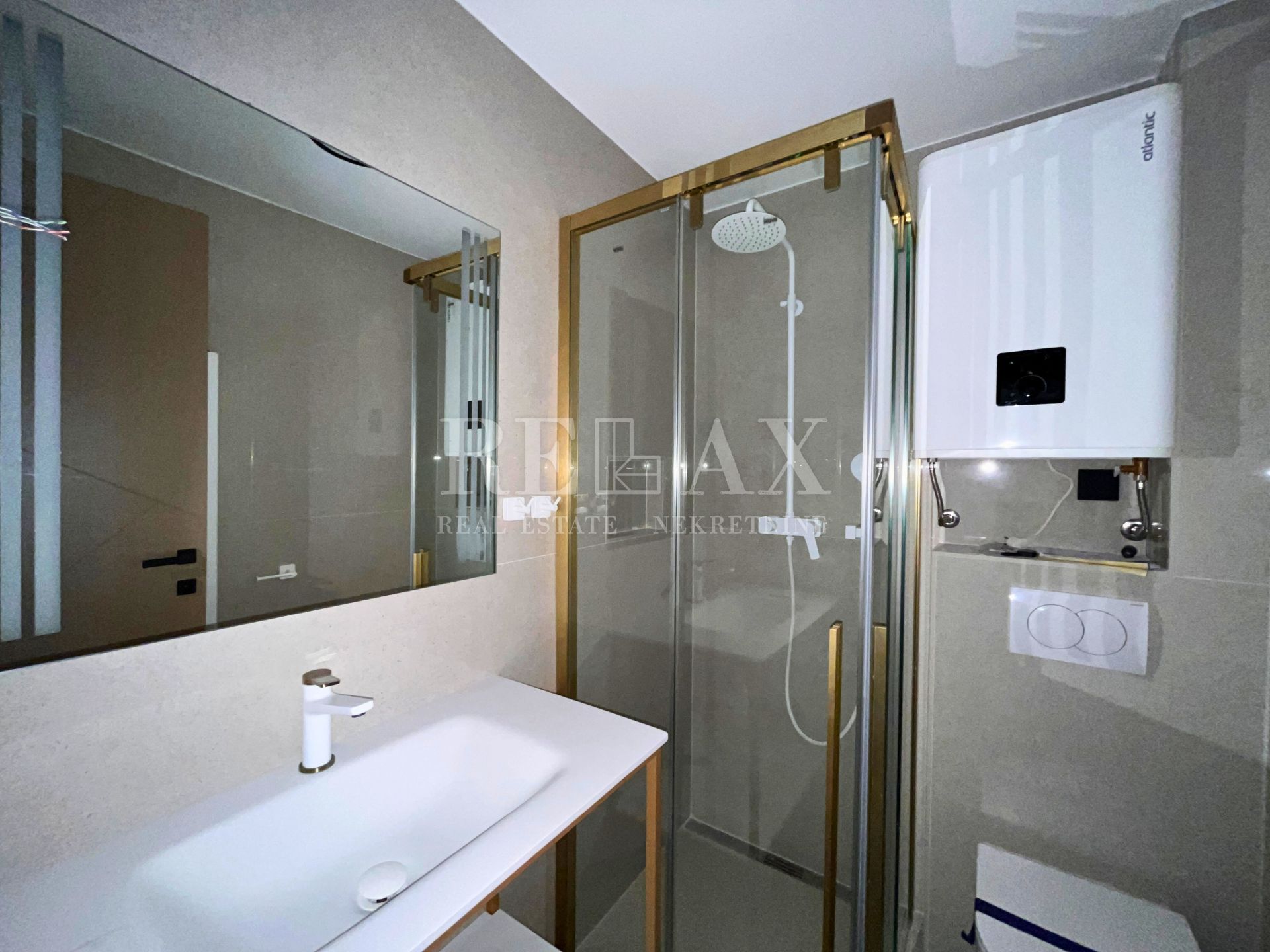 Ono što ga izdvaja već na prvi pogled jest visoka razina završne obrade – svaki detalj prostora promišljeno je odabran kako bi stvorio dojam suvremenog, udobnog i trajnog prostora. Kupaonica je opremljena namještajem izrađenim od Kerok materijala, potpuno otpornog na vlagu i mehanička oštećenja, dok su mat bijele slavine i tuš mješalice sa zlatnim detaljima elegantan kontrast velikim pločicama od poliranog gres porcelana velikih formata. Sanitarije su jednako pažljivo birane – školjke su mat bijele sa soft-close daskama.