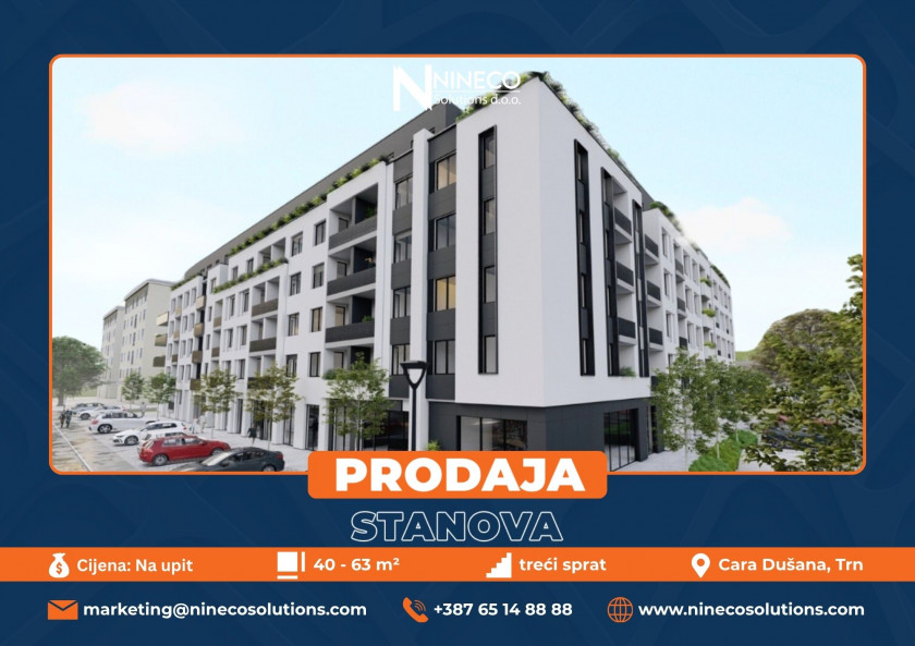 Na prodaju stanovi u novoj, moderno projektovanoj zgradi u Trnu, odmah iza marketa Đurić. Stanovi se nalaze na trećem spratu, u Lameli 2. Zgrada ima lift i obezbijeđen parking ispred.