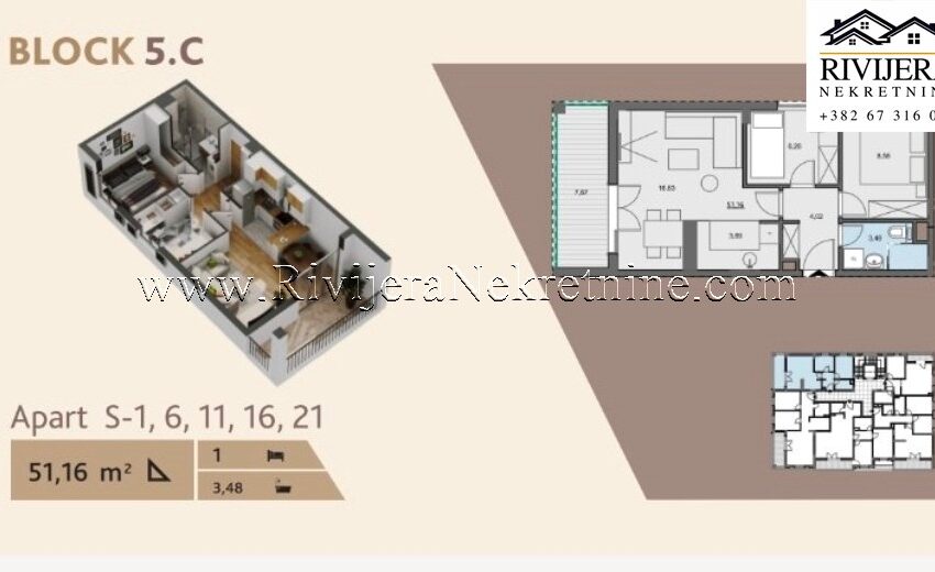 Opis: Prodaje se dvosoban stan u izgradnji u Tivtu, naselje Donja Lastva, površine 52m2. Stan je pozicioniran u lameli C predivng kompleksa udaljenog svega 500m2 od plaže.