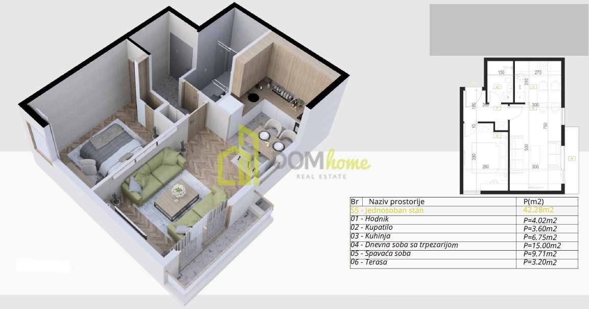 ✅ Struktura stana: Ulazni hodnik, dnevni boravak, kuhinja, trpezarija, spavaća soba, kupatilo i terasa.
