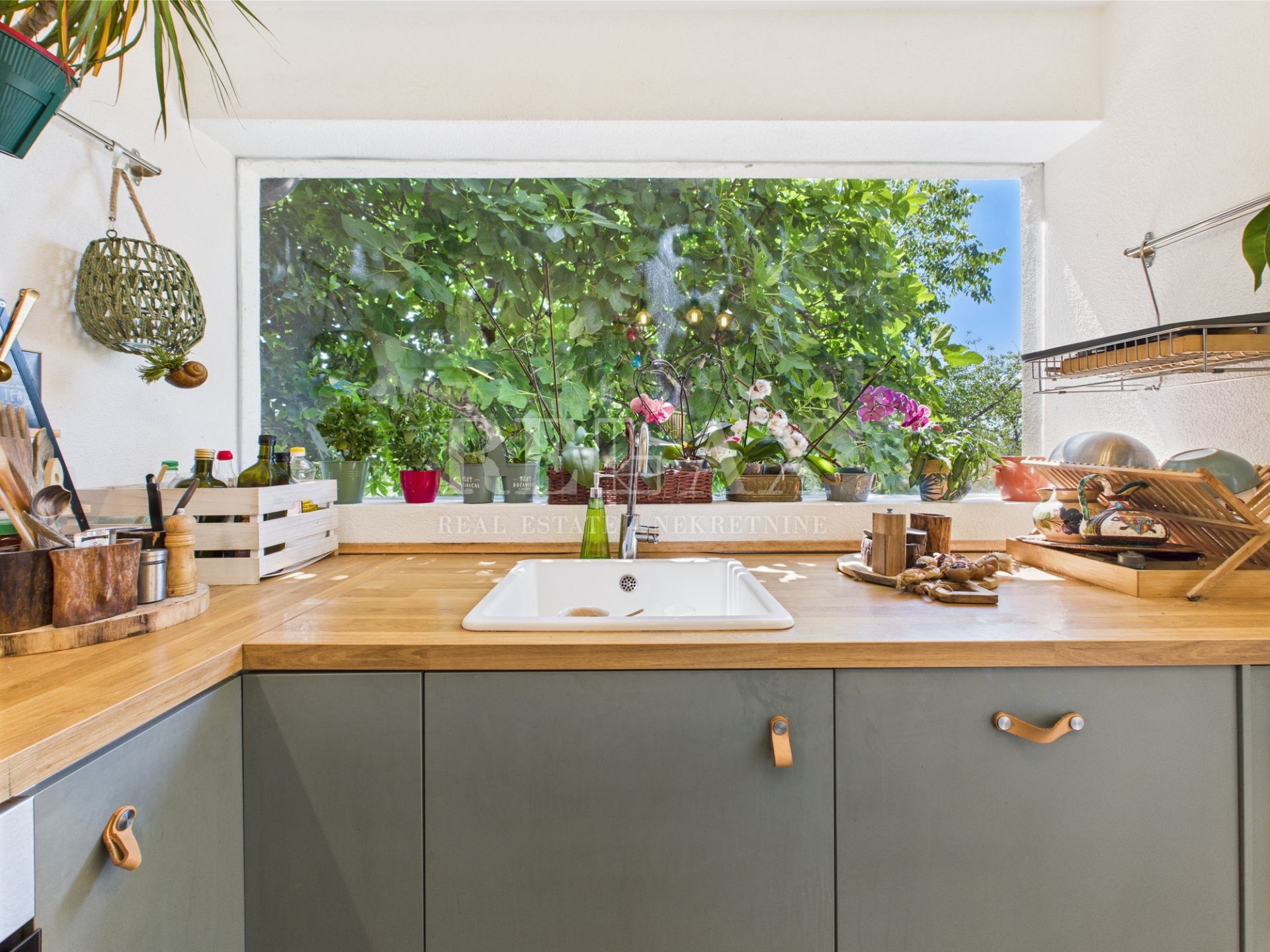 Iz dnevnog prostora izlazi se na prostranu kamenu terasu površine 37,16 m², okruženu zelenilom i cvijećem, savršenu za opuštanje ili druženje na otvorenom. Dodatno, stan raspolaže vrtom od 10 m² i ostavom od 2,70 m² u sklopu zgrade, što osigurava praktičan prostor za pohranu.