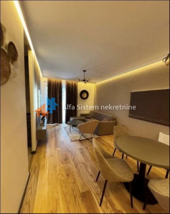 Stan je luksuzno opremljen i sastoji se od dnevnog boravka sa kuhinjom i trpezarijom, spavaće sobe, kupatila i terase. Grejanje je centralno, a stan poseduje klimu, internet, KATV i interfon.