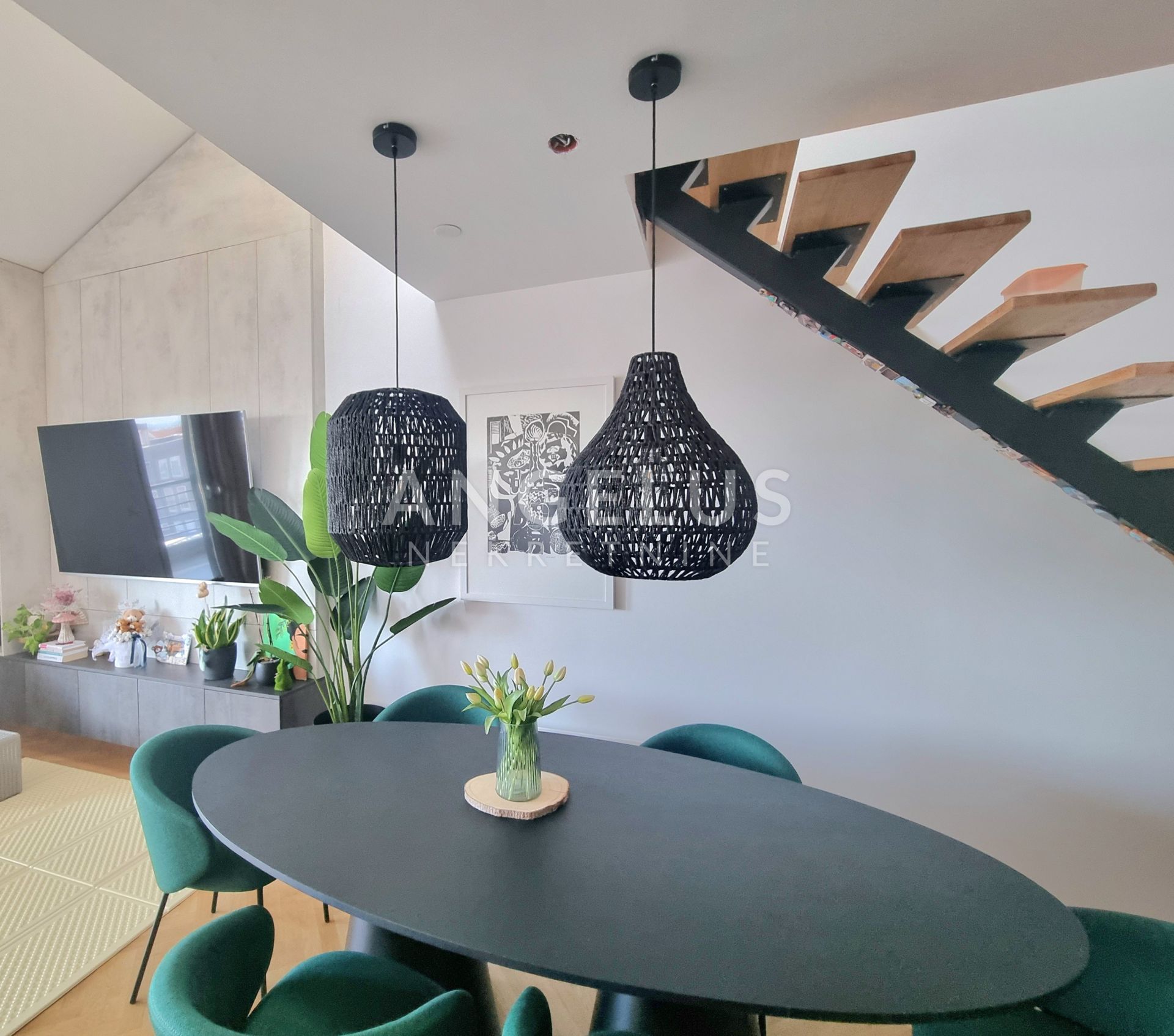 Stan je ukupne veličine 126 m2 te se proteže na dvije etaže. Na donjoj etaži se nalaze otvoreni dnevni boravak sa kuhinjom i blagovaonicom sa izlazom na lođu, dvije spavaće sobe, kupaonica i hodnik. Unutarnjim stepenicama dolazi na gornju etažu odnosno galeriju gdje se nalazi kupaonica te prostor koji je moguće prenamijeniti u treću spavaću sobu.