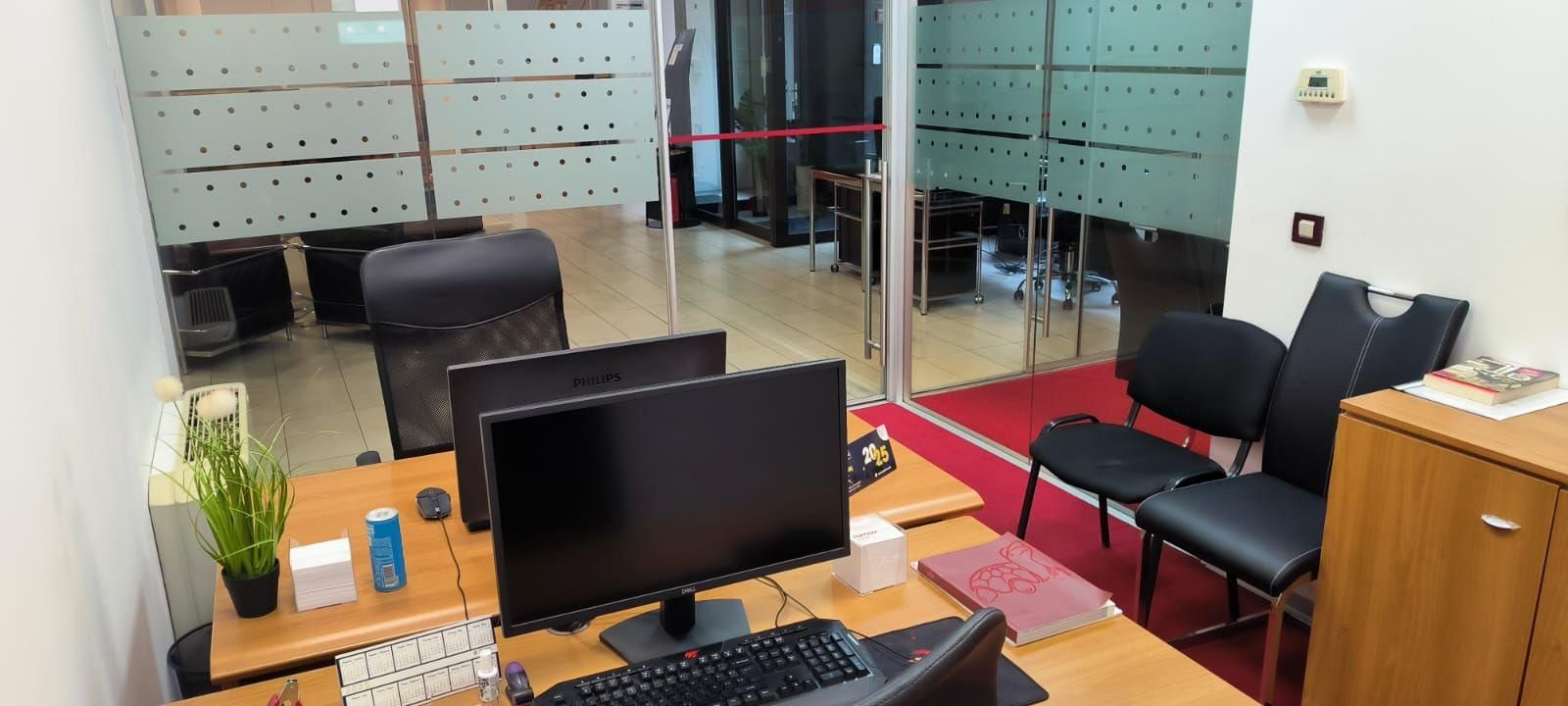 Prostor je idealan za jednu do dvije osobe, te je dio shared office koncepta.Oprema: 2 radna stola, komoda, ormar, uredske stolice.