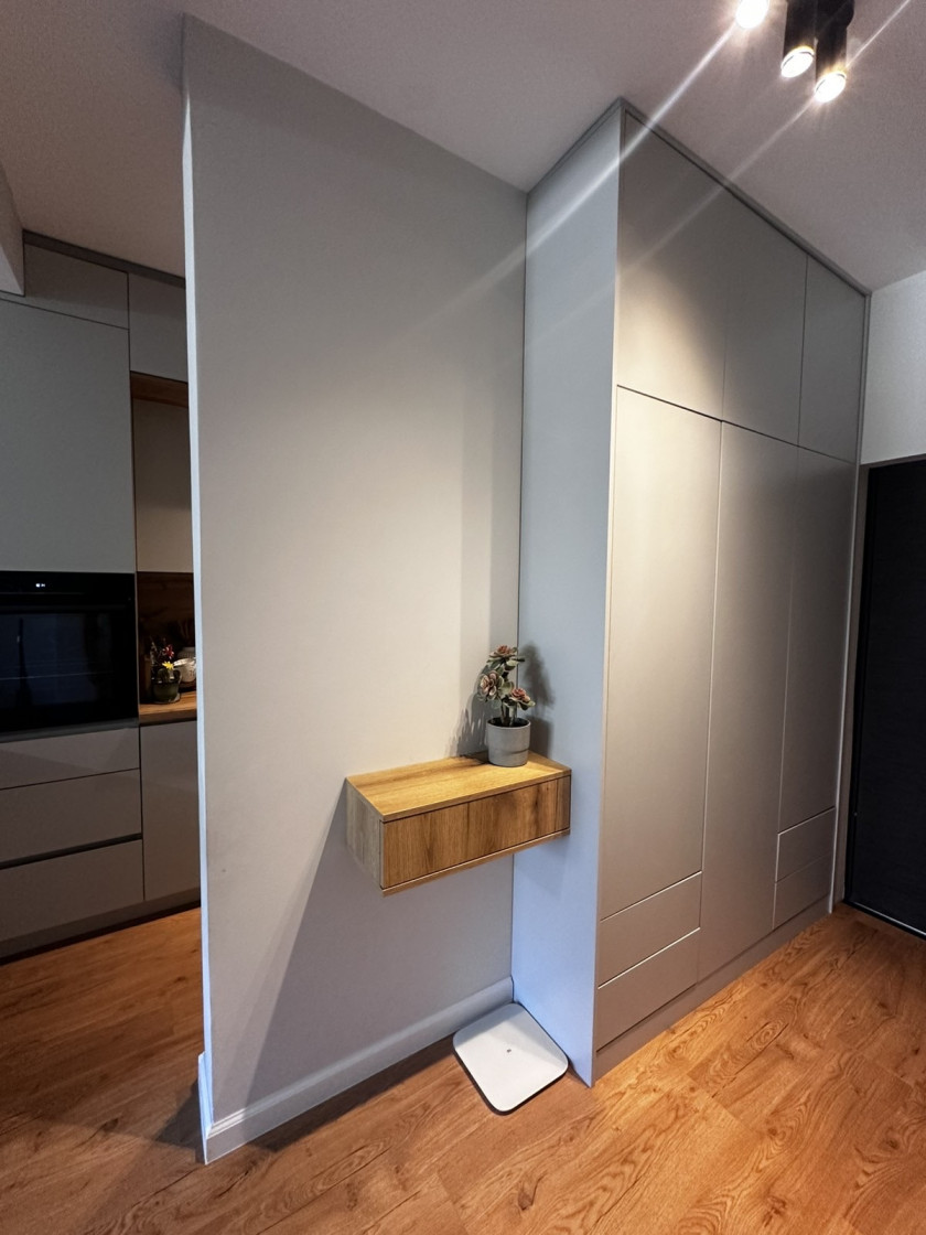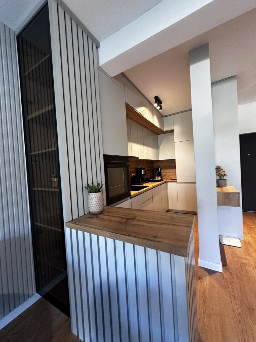Stan se sastoji od ulaznog hola, otvorenog dnevnog boravka sa kuhinjom i trpezarijom, dvije spavaće sobe, kupatila i terase sa pogledom na grad.