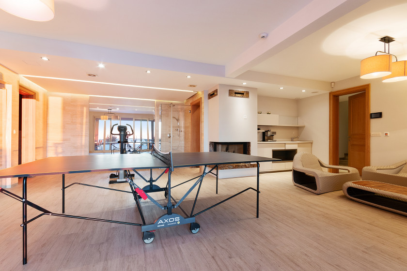 U prizemlju vile nalazi se spa sa saunom i jacuzzijem za 5 osoba. Također, soba za odmor s kaminom i biljarom, kupaonica, dvije tuš kabine, praonica rublja, teretana, vinski podrum, stan za osoblje koje služi.