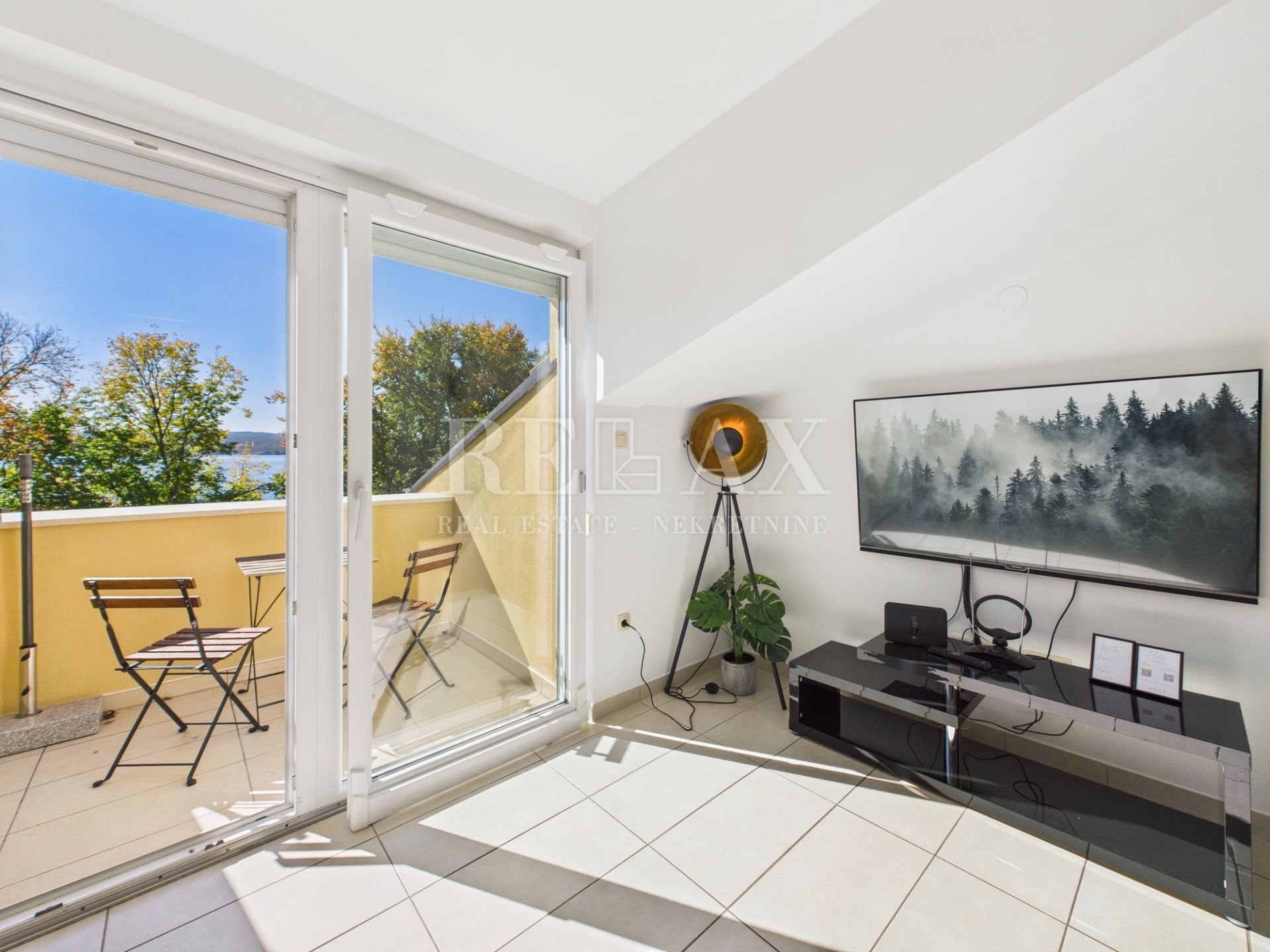 Posebnu vrijednost ovoj nekretnini daje južna orijentacija, zahvaljujući kojoj je stan tijekom cijelog dana okupan prirodnim svjetlom. Velike staklene stijene dodatno naglašavaju osjećaj otvorenosti i povezanosti s vanjskim prostorom. S obje lođe pruža se pogled na more, a plaža se nalazi svega 50 metara od zgrade.
