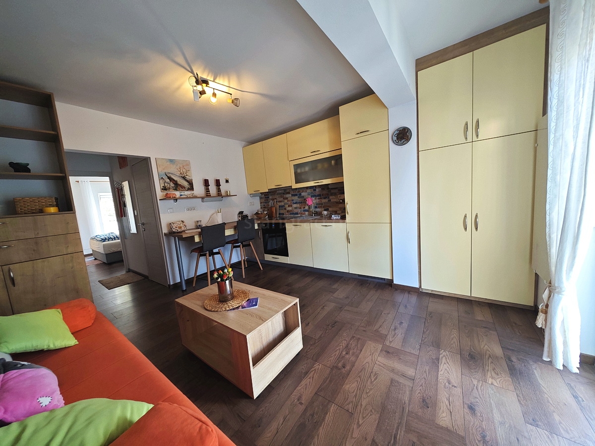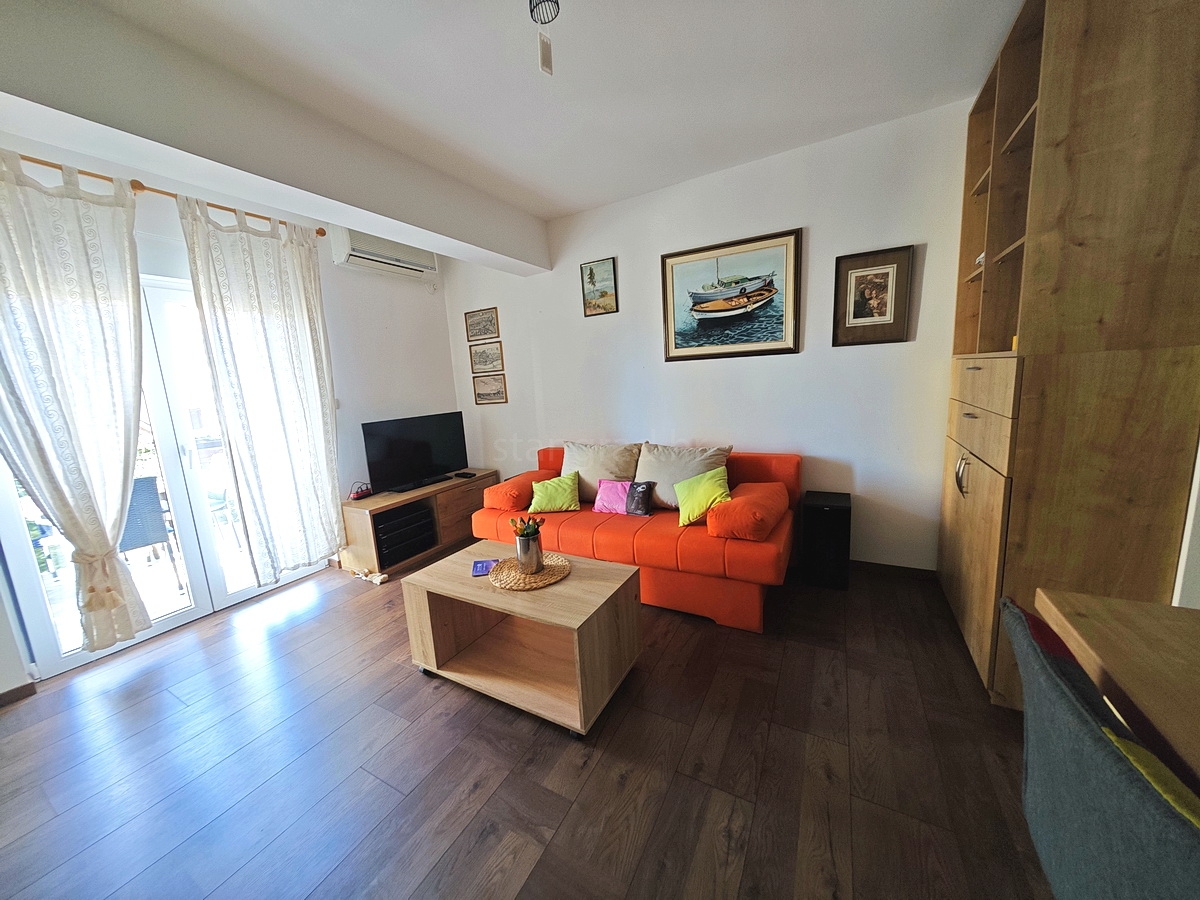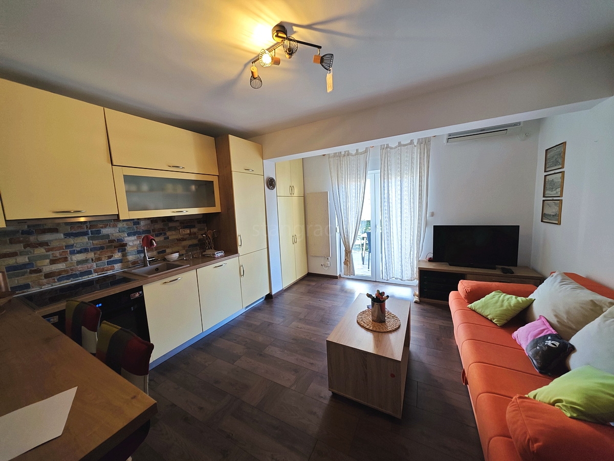 U vrlo dobrom i kvalitetnom objektu, apartman je smješten na 1. etaži. Površina ovog apartmana iznosi ukupno 53 m2. U navedenoj površini sadržani su ulazni prostor, dnevni boravak i kuhinja s blagovaonicom, spavaća soba, kupaonica i natkrivena terasa. Interijer nekretnine je vrlo dobro održavan te kompletno opremljen svim potrebnim tehničkim uređajima i kvalitetnim namještajem.