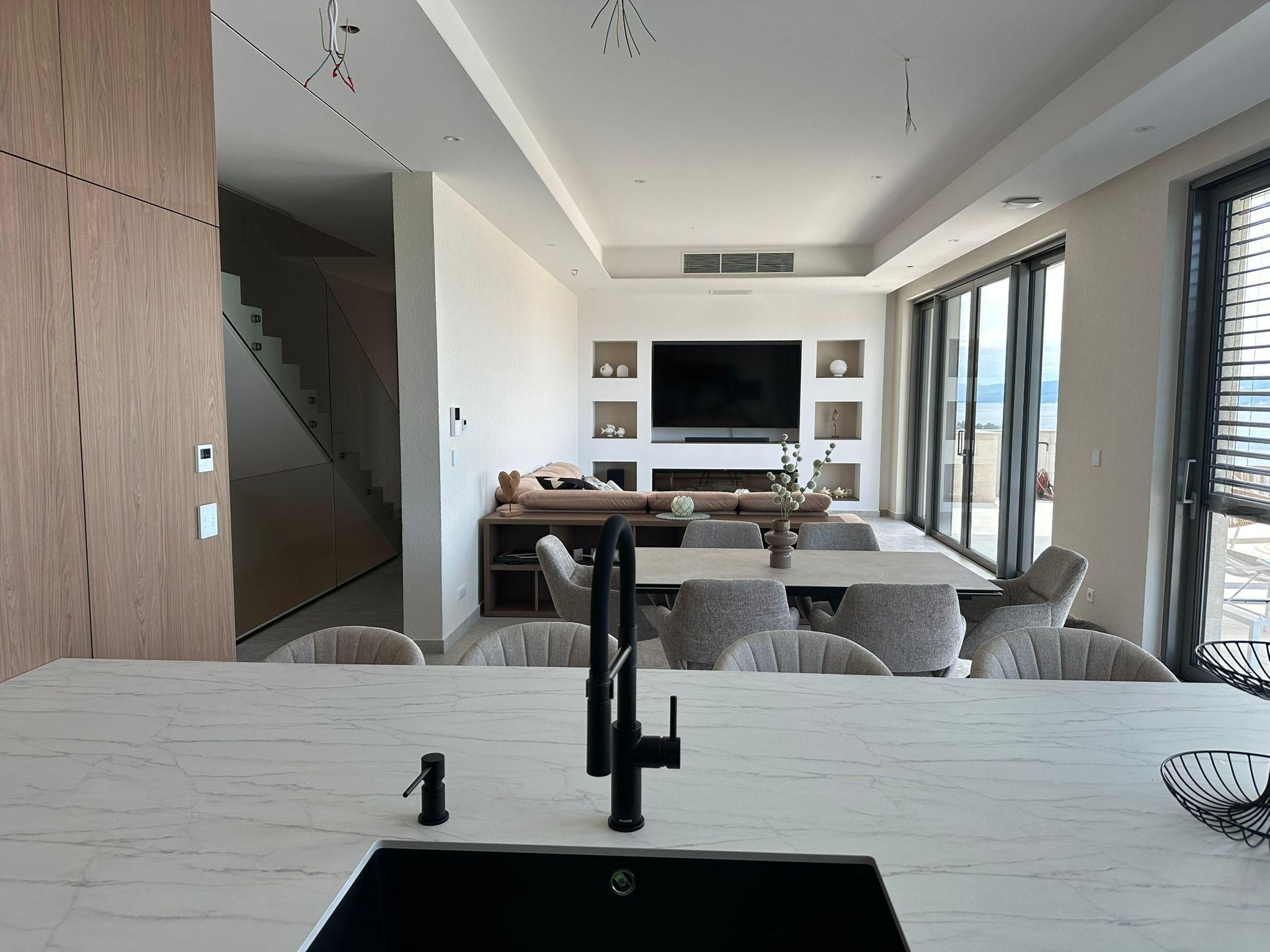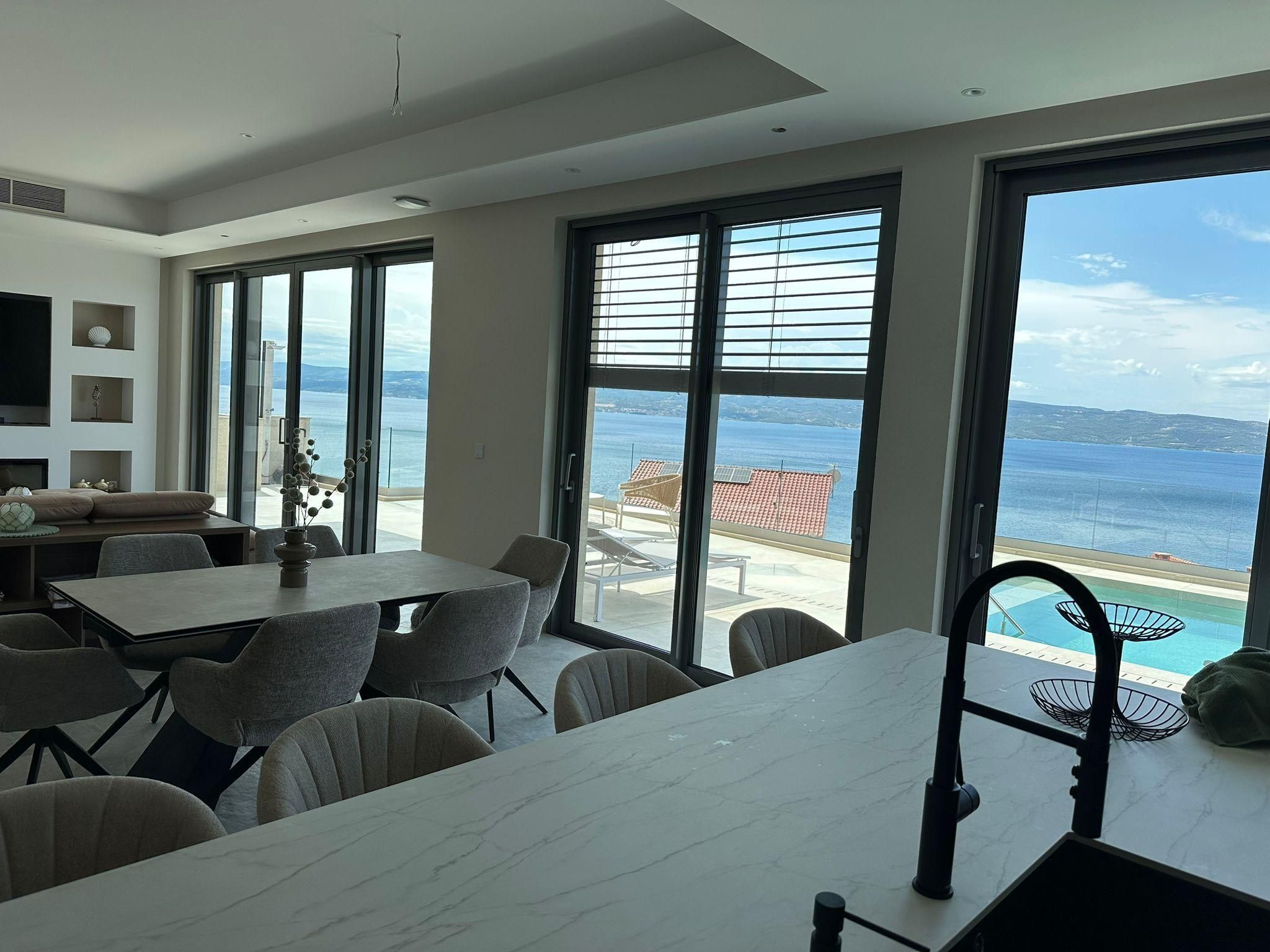 Vila se prostire na tri etaže, ukupne stambene površine od 355 m², smještena na zemljištu od 442 m². U podrumu se nalazi garaža s parkirnim mjestima, ostava i sauna, pružajući dodatnu praktičnost i prostor za relaksaciju. Na prvom katu smješteni su prostrani dnevni boravak te unutarnja i vanjska kuhinja, s izlazom na veliku terasu s predivnim pogledom na more, idealnom za opuštanje i druženje. Na drugom katu nalaze se tri spavaće sobe, svaka s vlastitom kupaonicom, terasom i balkonom koji pružaju panoramski pogled na more i okolinu.