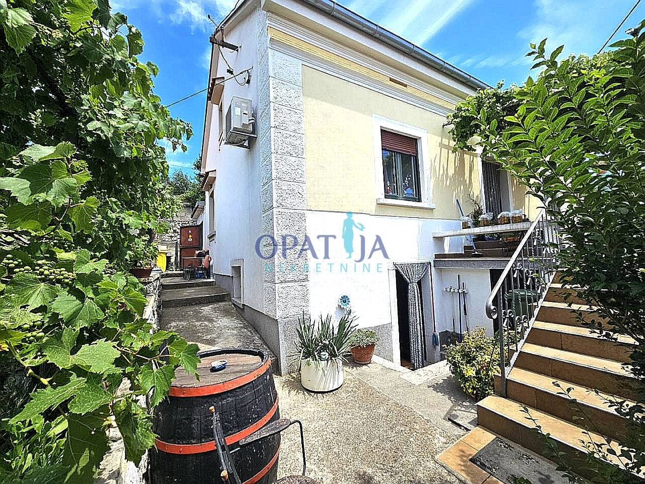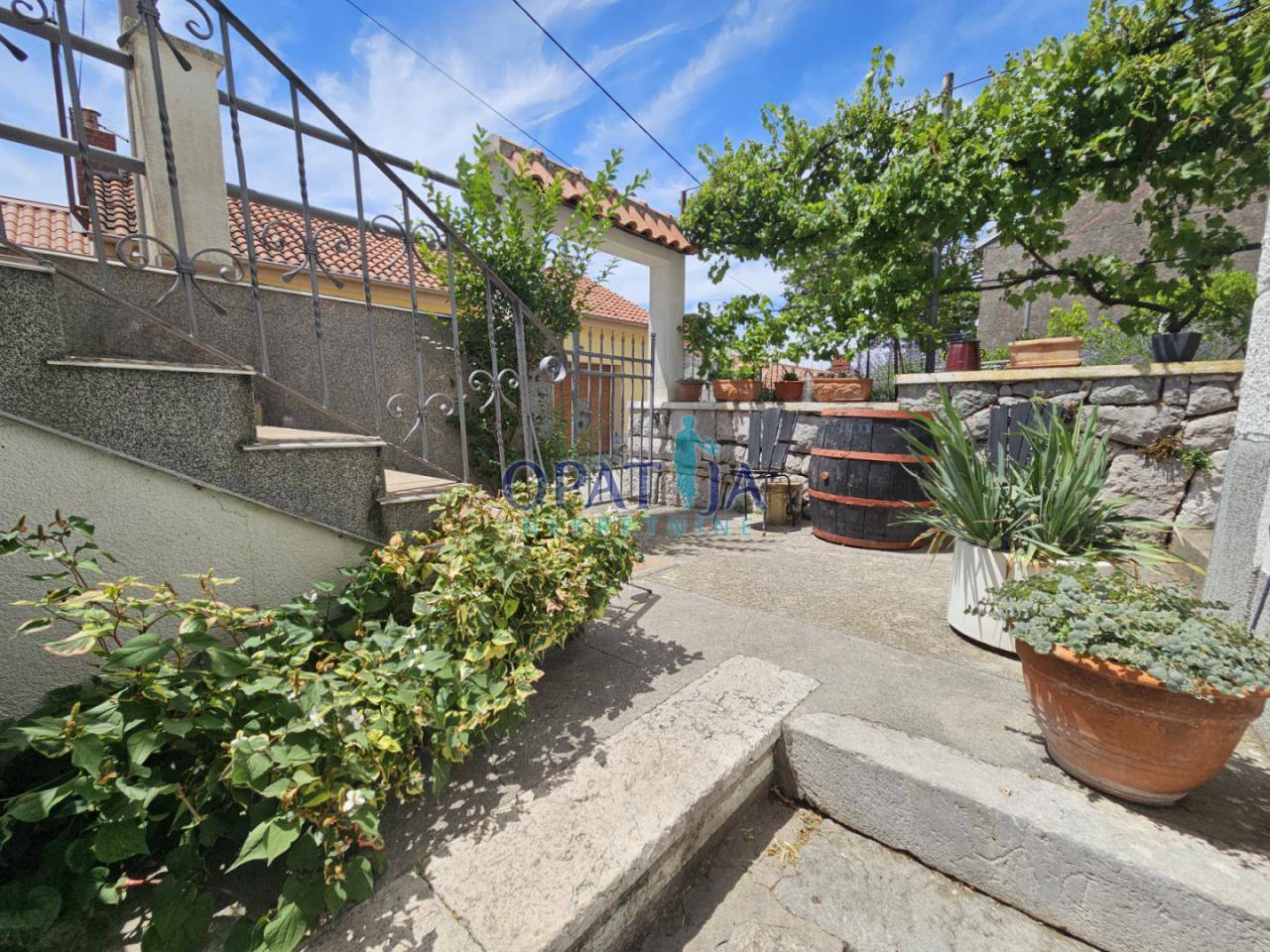 Vrt je potpuno ograđen, uređen je sa cvijećem i mediteranskim biljem. Kuća je južno orijentirana, na sunčanoj strani, sa pogledom na more koji se proteže kroz cijeli Kvarnerski zaljev i otoke.