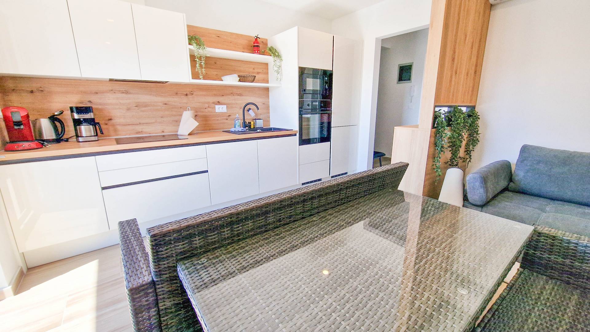 Opis: Stan se sastoji od prostranog dnevnog boravka s kuhinjom i blagovaonicom, velike terase s pogledom na more, dvije spavaće sobe, kupaonice i hodnika. U vlasništvu su i dva...