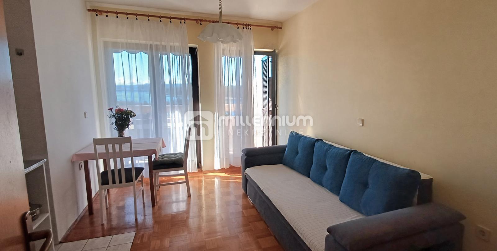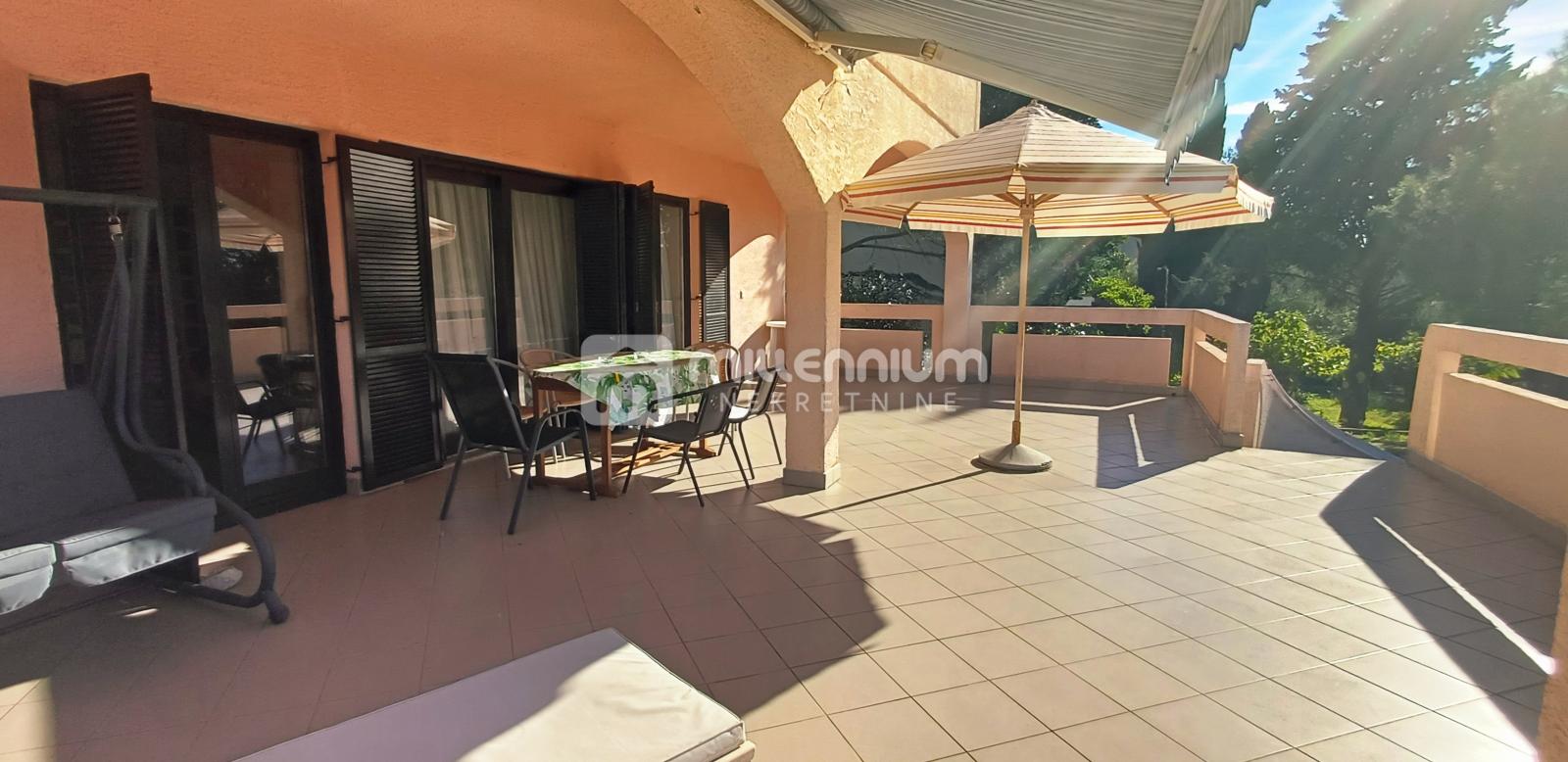 Na prvom katu nalazi se prostran stan površine 100m², koji se sastoji od dnevnog boravka, kuhinje s blagovaonicom, ostave, kupaonice, balkona i velike terase s prekrasnim pogledom na more. Isti kat uključuje i dva studio apartmana sa zasebnim ulazima sa stražnje strane kuće.