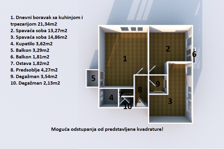 Opis: Iznajmljujemo lijepo uređen i izuzetno svijetao trosoban stan, površine 68m2. Stan se nalazi na drugom spratu stambene zgrade izgrađene u ulici Envera Čolakovića, u sarajevskom naselju Mejtaš. Zbog jugozapadne orijentacije i velikih prozorskih otvora vrlo dobro je osvijetljen i prozračan tokom cijelog dana. Sastoji se od dnevnog boravka sa kuhinjom i trpezarijom, dvije spavaće sobe, kupatila, ostave i dva balkona. Stan je nedavno potpuno renoviran. Ispred zgrade se nalazi vanjsko parking mjesto.