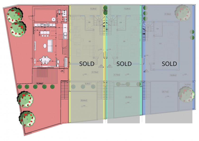 Kuća se sastoji od dnevnog boravka/kuhinje, 2 ili 3 spavaće sobe, 2 kupaonice, 2 terase i parkinga.
