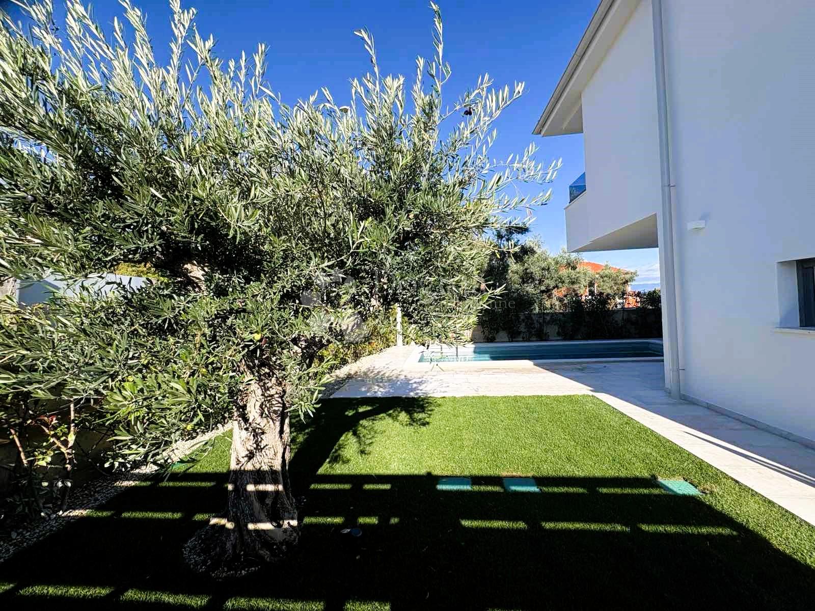 Okućnica od cca 180 m² uređena je mediteranskim raslinjem i stoljetnim maslinama, a na raspolaganju su dva privatna parkirna mjesta.
