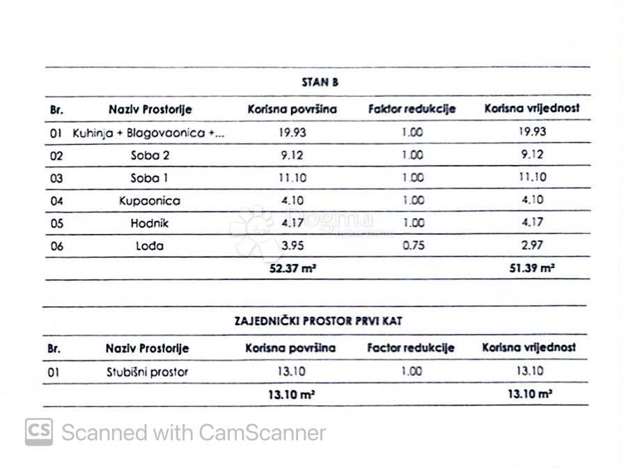 Ukupna površina stana iznosi 51,39 m² unutarnjeg prostora, a sastoji se od: