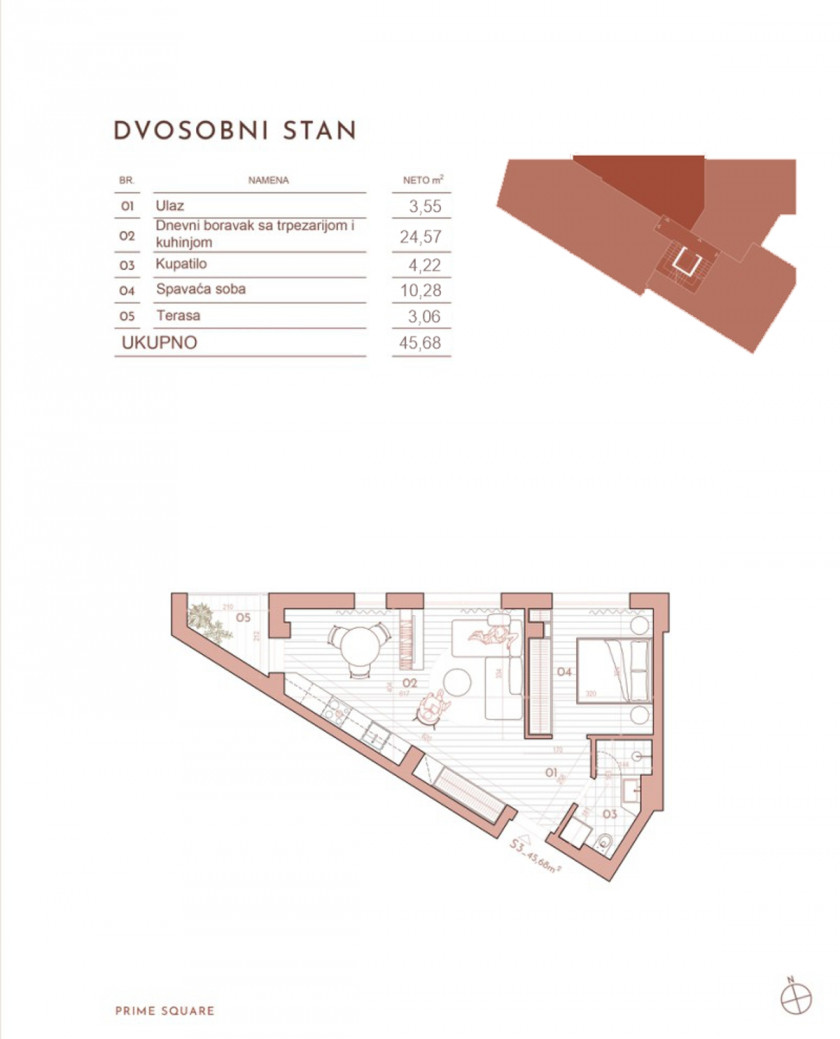 U okviru Prime Square objekta u ponudi su dvosobani stanovi od 45,68m2 po ceni od 250.738€(4.990€/m2+pdv) na I II III i IV spratu