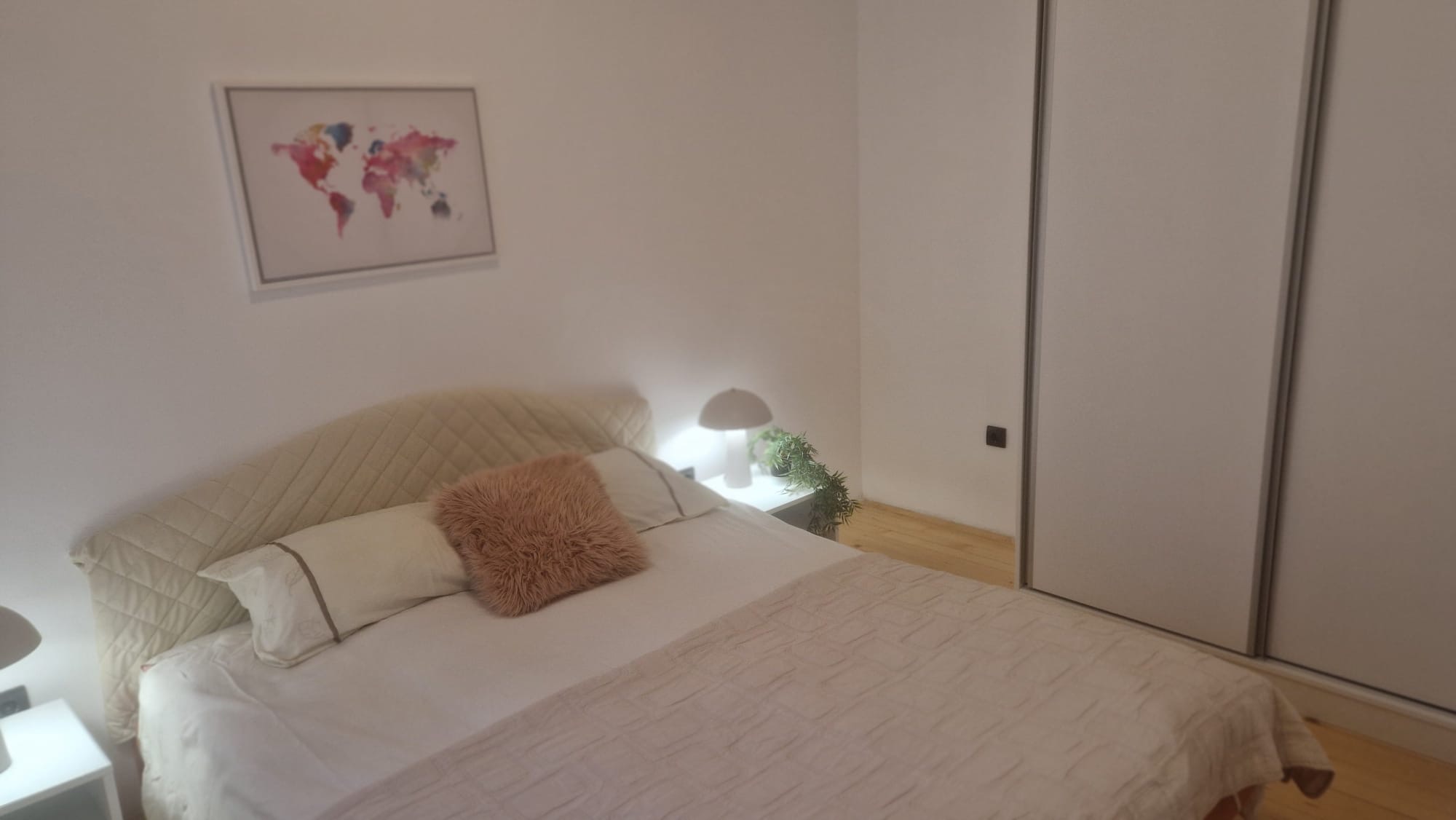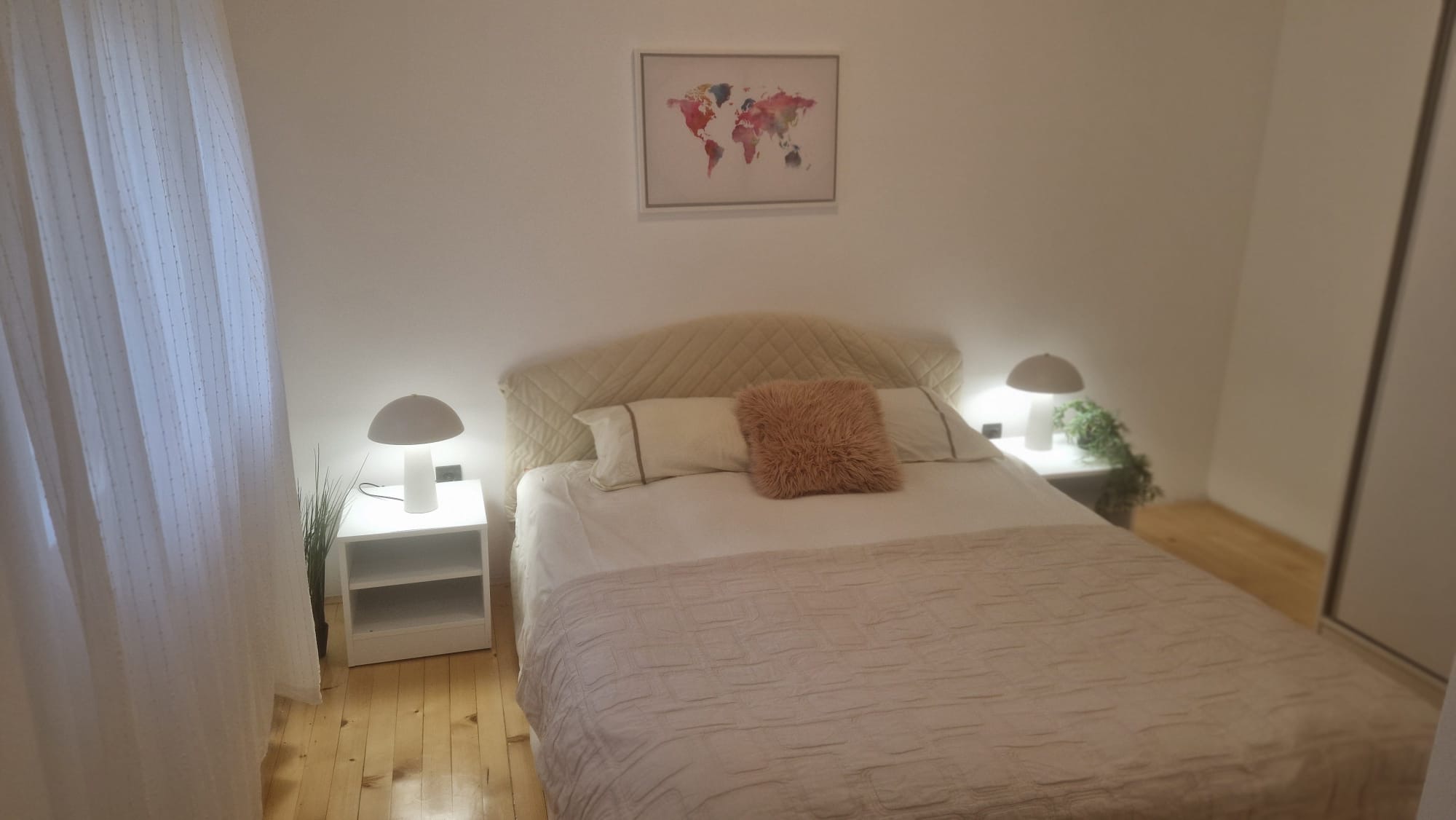 Stan ima spavacu sobu, dnevnu sobu, hodnik, veliku kuhinju, kupatilo i parking mjesto ispred kuce. Prvi sprat.