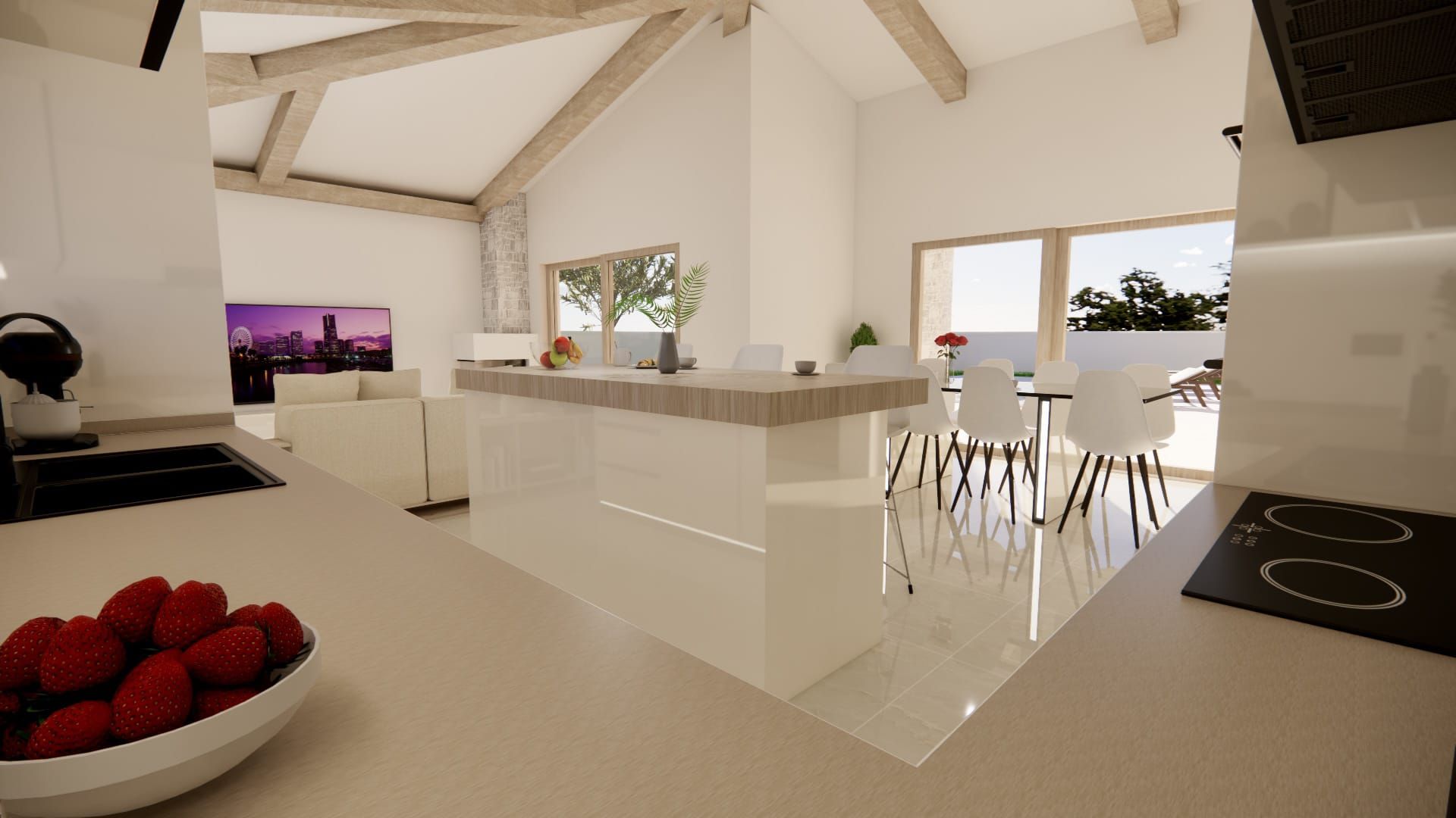 Opis (Engleski): We offer detached, single-storey villa with swimming pool just 10 km from the sea in Labin-Rabac area!The villa is currently under construction. It is located at the end of a small village surrounded by greenery and olive groves.tThis new property of 130 sq.m. consists of three bedrooms, the master of which has its own bathroom with toilet, open space concept living room with kitchen, hallway, utility room, second bathroom with toilet and covered terraces. The spacious garden has parking spaces, a swimming pool and a cultivated garden. The size of the swimming pool is 8x4 (32 m2). Cooling in the house is provided by air conditioners. The villa will be finished with first-class materials. There is a possibility, since it is under construction, that the future buyer can adjust the floor plan and layout to his liking. The first phase of underfloor heating will also be installed, so the customer can choose heating in the house. The house is sold in the turnkey phase and the buyer is exempt from real estate tax. Below the house is an olive grove and a green belt, and there is no further construction....