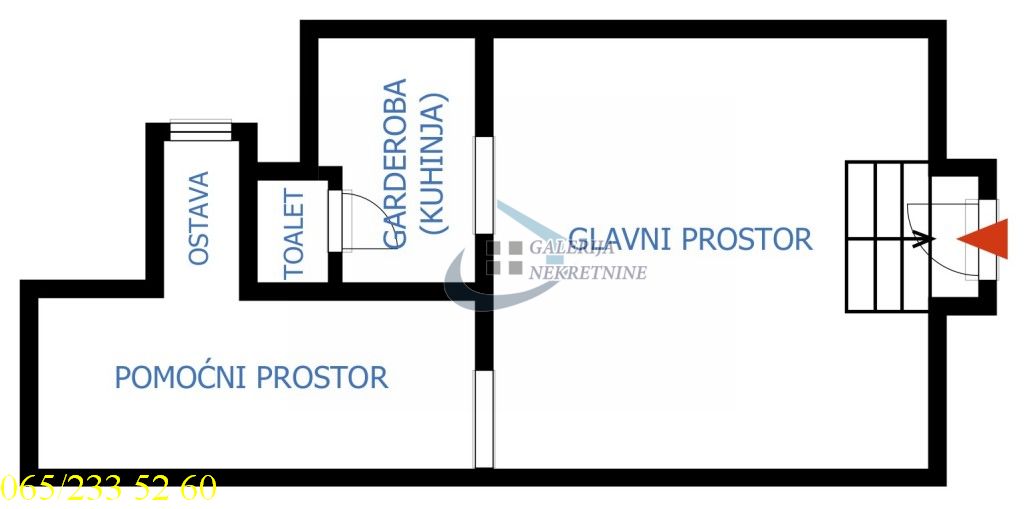 Od prostorija: Glavni prostor, sporedni prostor, garderoba (kuhinja), toalet i ostava.