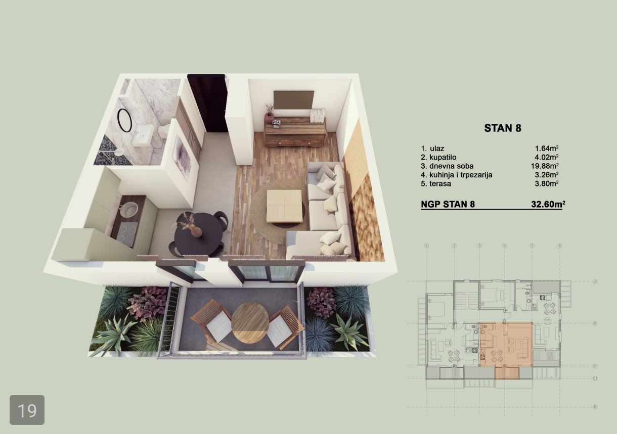 Površina: 37,14 m² + krovna terasa 32,60 m²