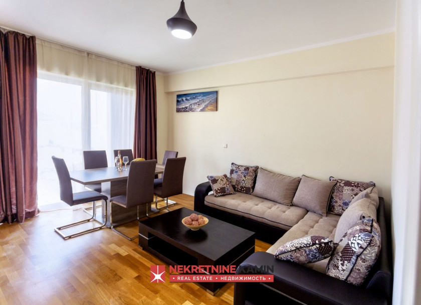 Opis: Prodaje se moderan i potpuno opremljen dvosoban stan površine 81m², smješten na osmom spratu prestižnog kompleksa Harmonija u Budvi.