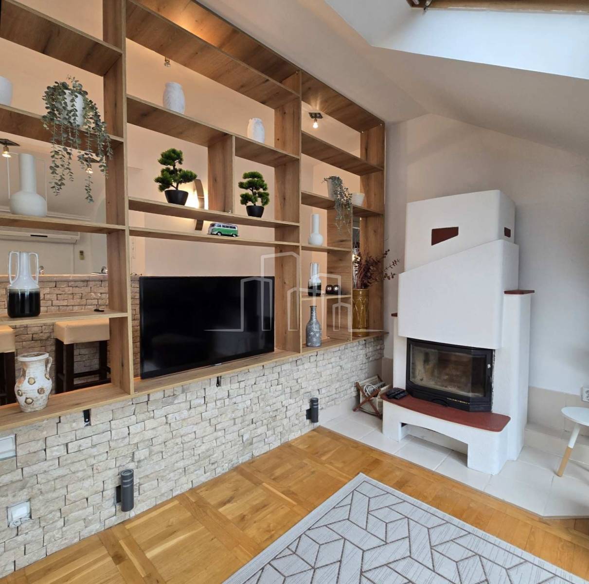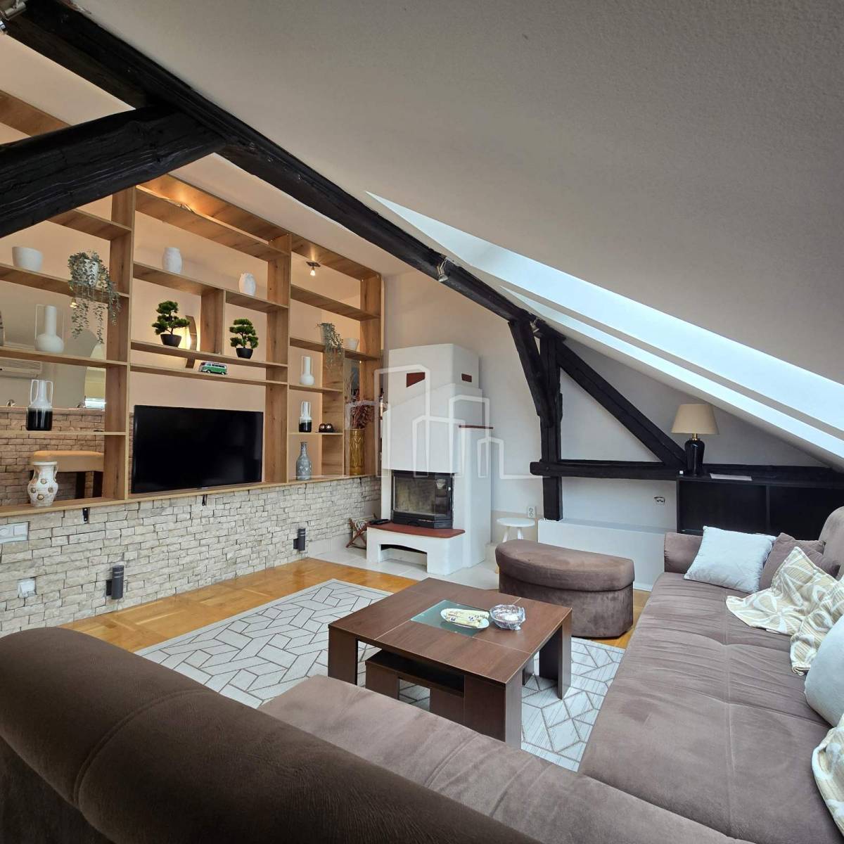 Stan je površine 104m2 i sastoji se od ulaznog hodnika, degažmana, dnevnog boravka, kuhinje, trpezarije, toaleta, kupatila, predsoblja i tri spavaće sobe. Vanjska i unutrašnja stolarija drvena. Podovi parket i keramika. Grijanje centralno - etažno plinsko i na struju - konvektori. Stan je klimatiziran.